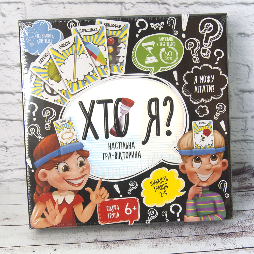 Настольная игра Кто я? не стала исключением. Она являет собой мини-викторину и развивает у деток память, воображение, ассоциативное и логическое мышление. Такое развлечение станет отличным подарком благодаря яркой и красочной упаковке. Все объяснения и надписи в игре указаны на украинском языке, что помогает лучше его выучить. Викторина превосходно подойдет для компании из 2-4 детей старше шести лет. Ее суть состоит в том, что ребенок, задавая вопросы, должен отгадать своего персонажа. У малыша на это есть всего одна минута, а игроки могут давать только односложные ответы — да или нет. Все необходимое для проведения игры есть в коробке: карточки с интересными рисунками, 4 обруча, фишки и песочные часы. Комплектация: игровые карточки - 108 шт., фишки - 100 шт., песочные часы - 1 шт., обруч из картона - 4 шт., инструкция - 1 шт