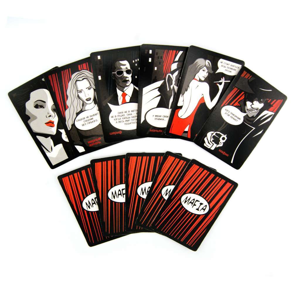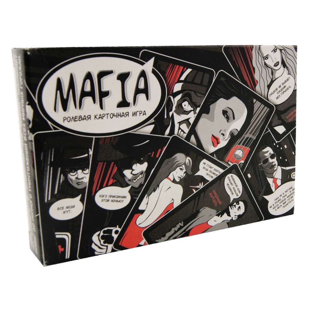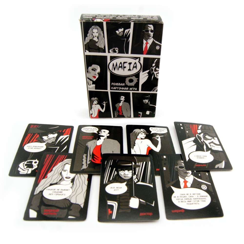 Ролевая игра Мафия - всемирно известная игра, где жители города вычисляют и нейтрализируют блефующуюу и изысканно замаскировавшейся мафи, а ганстеры по одному отстреливают простых обывателей. Ввяжитесь в бескомпромиссную борьбу за город и приведите свою сторону к победе. поминающиеся иллюстрации, характерные персонажи и общее оформление придутся по душе каждому, кто ценит отличные настольные игры и знает толк в качественных компонентах. Среди всех компанейских настольных игр – Мафия самая популярная и часто играемая. Каждый может сказать, что он хоть раз играл в Мафию и знает много своих друзей и знакомых, которые постоянно в неё играют.