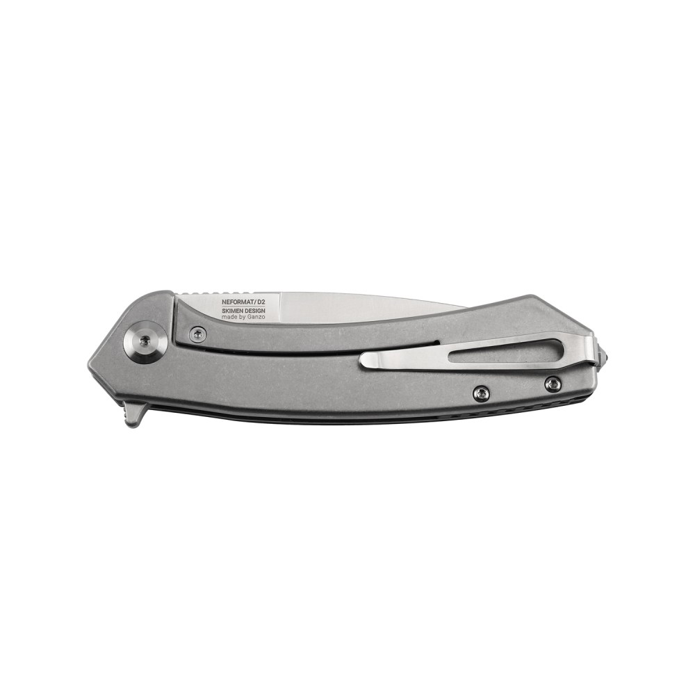 В основе ножа – сверхпрочная, износостойкая сталь марки D2. Защищенный от коррозии металлический сплав показывает высокие показатели жесткости. Значение жесткости у ножа – около 60 единиц по шкале Роквелла, что очень хорошо для данного вида продукции. Тип заточки – прямой. Длина клинка составляет восемь с половиной сантиметров, толщина – три с половиной миллиметра. Модель складная, лезвие извлекается с помощью удобного замка Flipper. Skimen надежно защищен от случайного открытия или закрытия. Он безопасен в применении и имеет простую конструкцию. Общая длина изделия – всего 20,5 сантиметра. Такие компактные габариты предпочитают нож для применения каждый день. Его можно легко положить в сумку или карман, и применять по необходимости модель всегда под рукой.