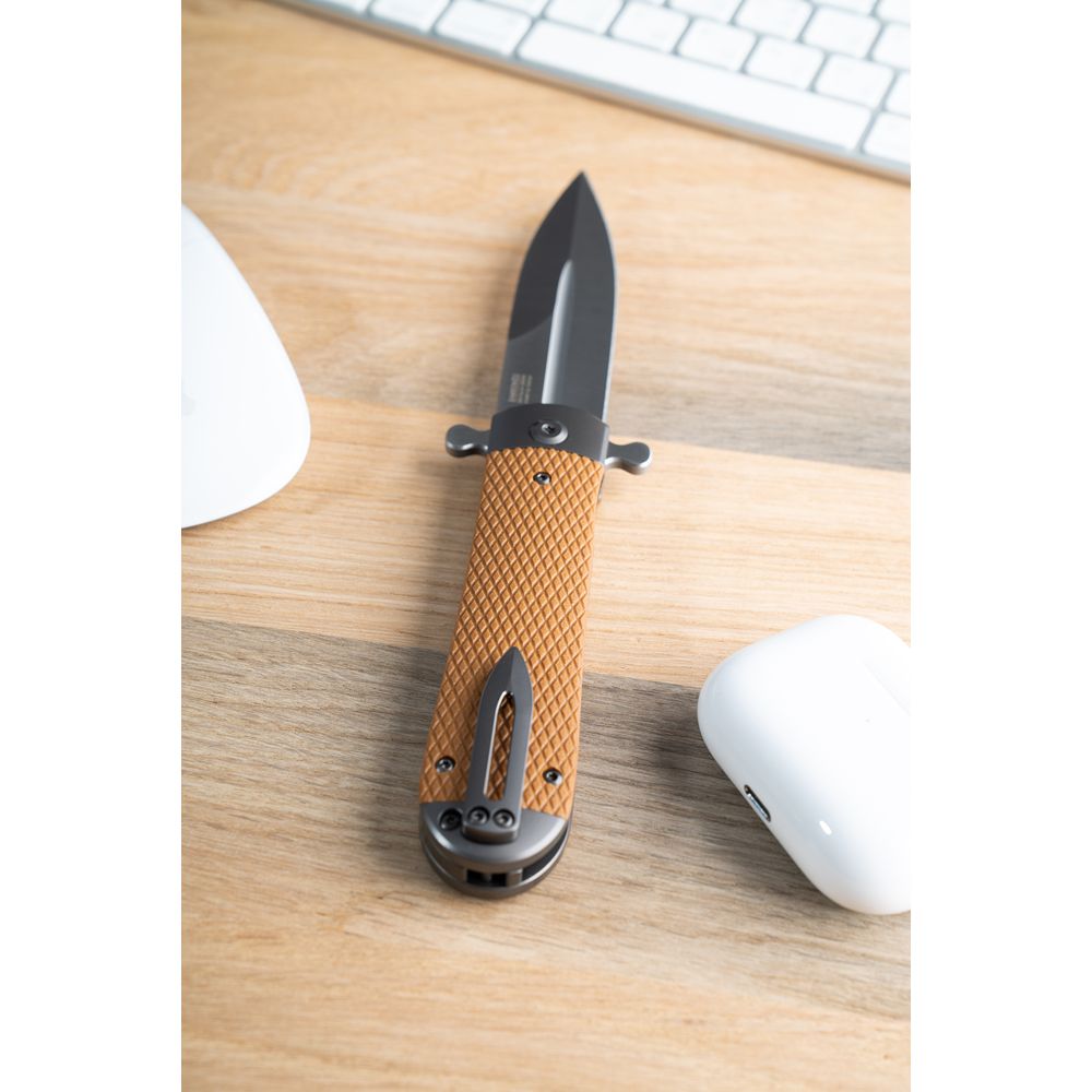 Клинок имеет форму Spear-Point с фальшлезвием со стороны обуха. С такой копьевидной формой легко выполнять колючую работу, когда нужно что-то подковырнуть, наколоть или тонко надрезать. С базовыми задачами клинок эффективно справляется за счет своей длины в 94 миллиметра и толщины, что составляет 3.5 миллиметра.