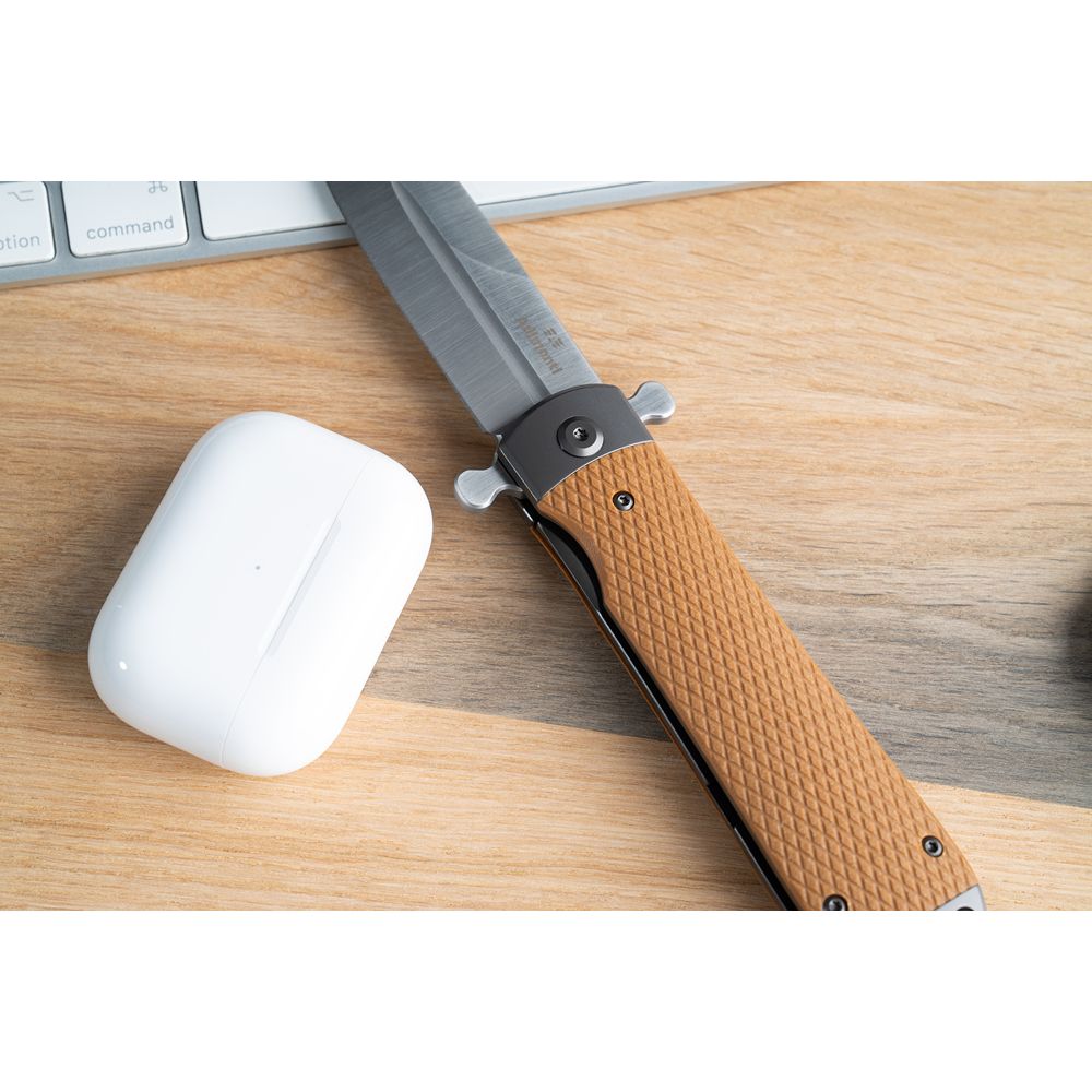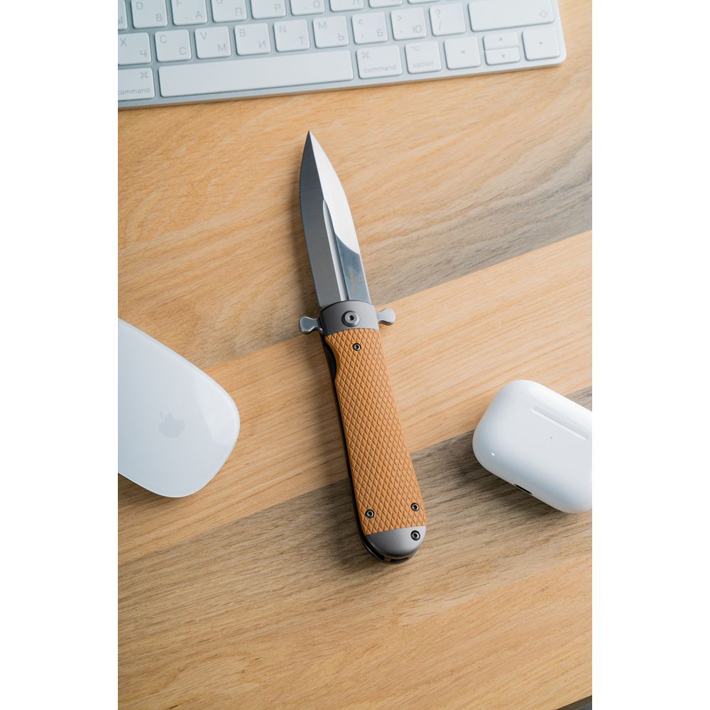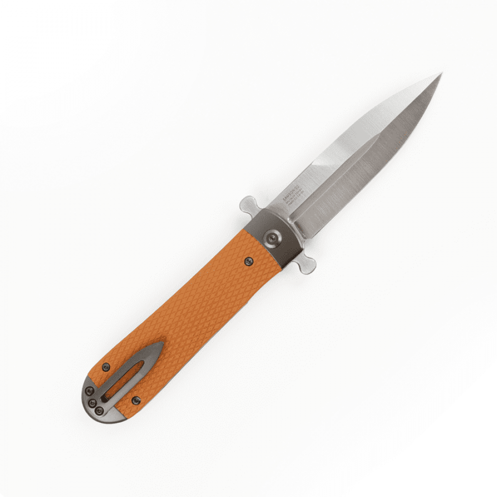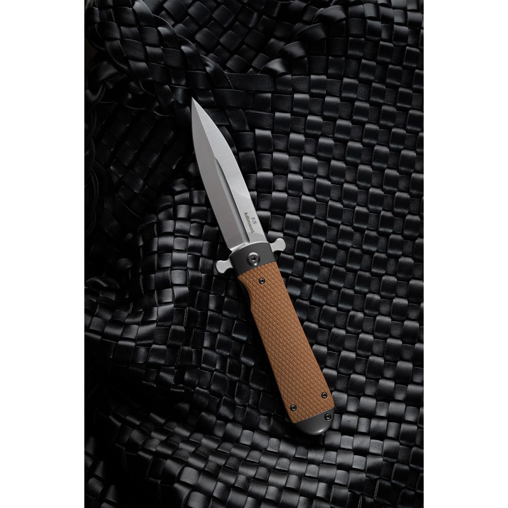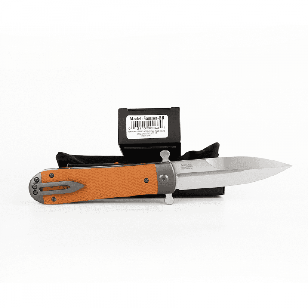Нож Adimanti Samson имеет визуальное сходство с копьем благодаря симметричному клинку. Изделие рассчитано на использование как в городских, так и в полевых условиях, поскольку оно имеет компактные габариты для комфортного ношения в кармане и имеет высокую устойчивость к воздействию агрессивных сред, особенно ряда кислот и обычной влаги.