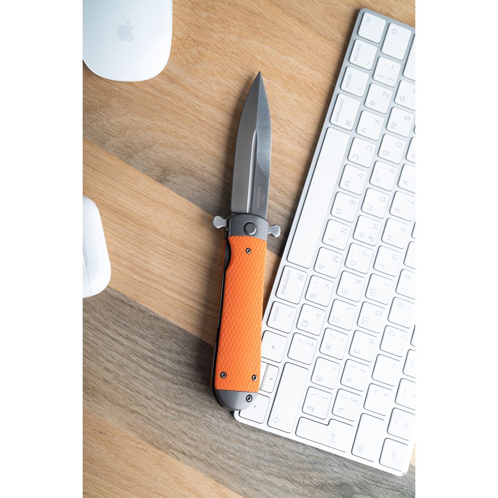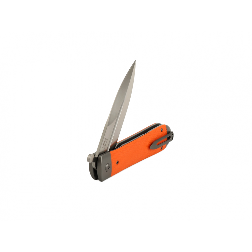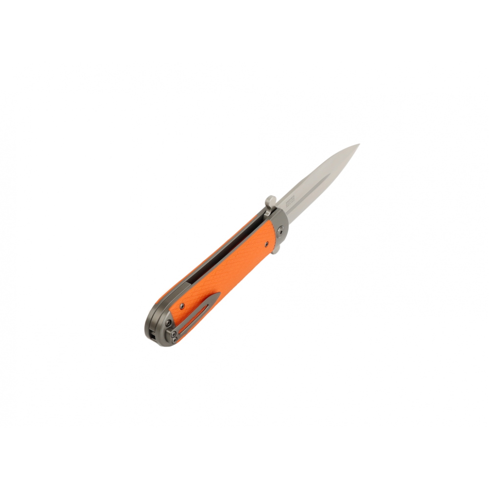 Клинок имеет форму Spear-Point с фальшлезвием со стороны обуха. С такой копьевидной формой легко выполнять колючую работу, когда нужно что-то подковырнуть, наколоть или тонко надрезать. С базовыми задачами клинок эффективно справляется за счет своей длины в 94 миллиметра и толщины, что составляет 3.5 миллиметра.