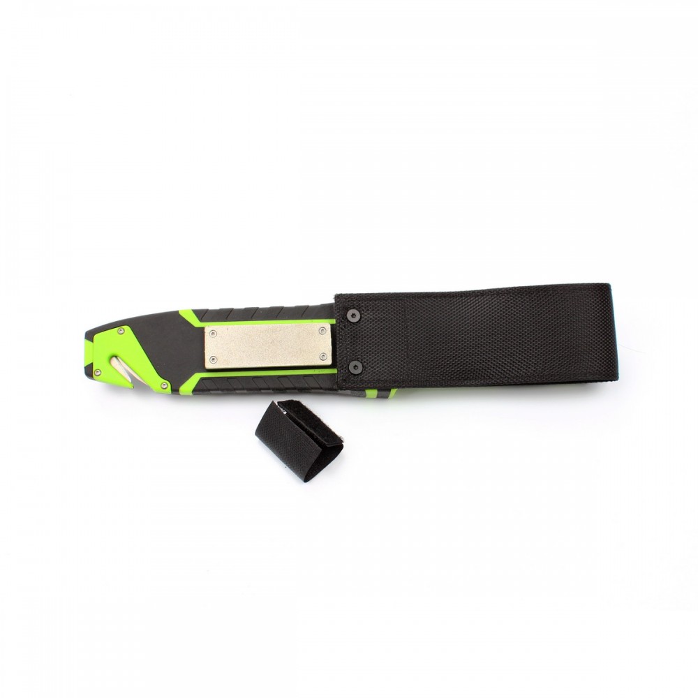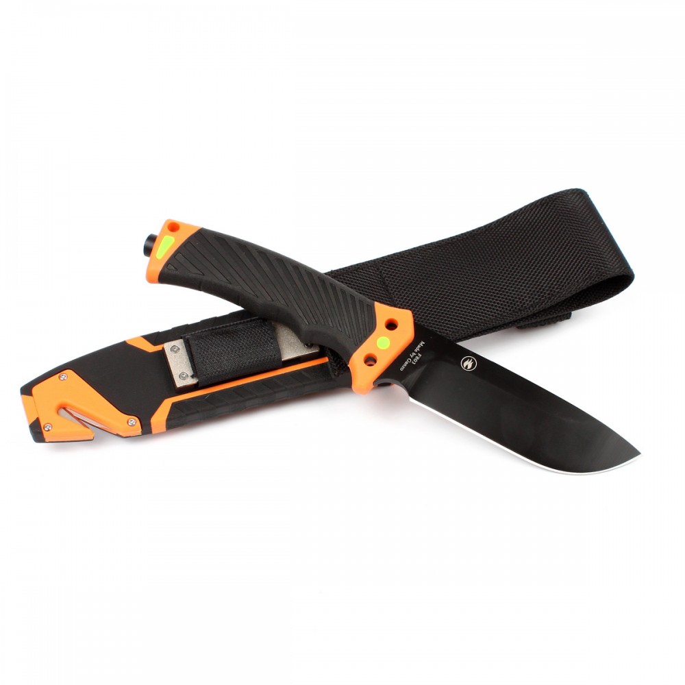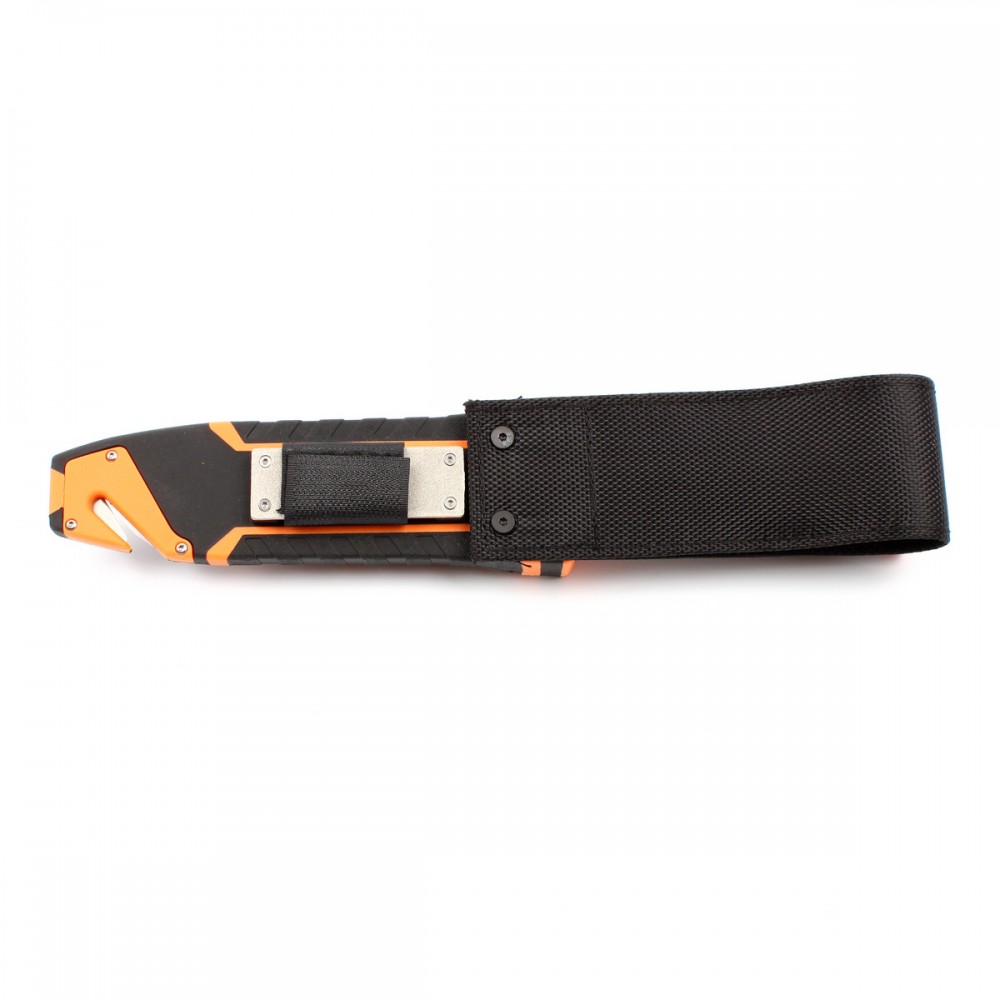 Рукоятка отлично приспособлена для удобной работы. Она сделана из термопластика с большим запасом прочности, а поверхность материала — прорезиненная, чтобы нож не ускользал из рук. Основной цвет рукоятки – черный, но отдельные элементы сделаны ярко оранжевыми, чтобы клинок был хорошо заметен на разных поверхностях. А чтобы найти его не составило труда даже в темноте, на рукоятке есть пара небольших светонакопительных элементов. В качестве дополнительного инструмента на торце рукоятки имеется небольшой стеклобой.