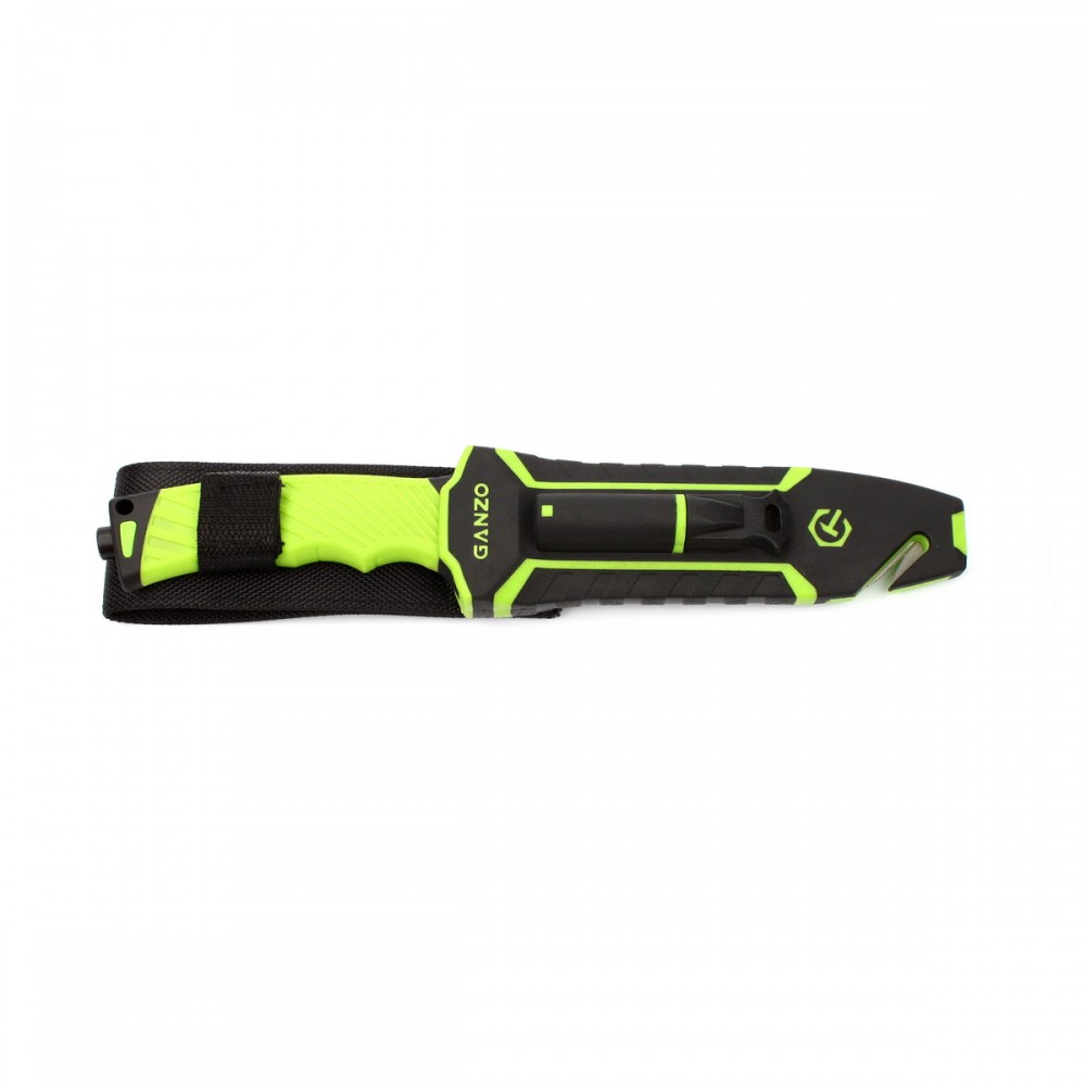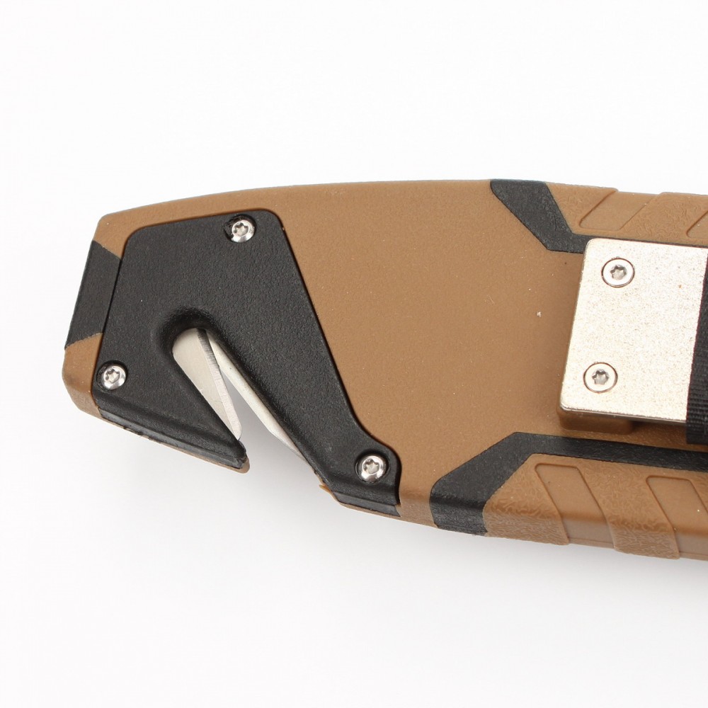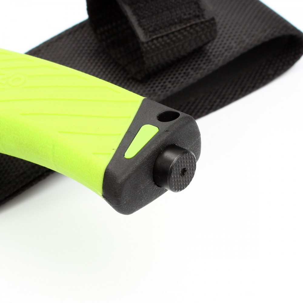 Рукоятка отлично приспособлена для удобной работы. Она сделана из термопластика с большим запасом прочности, а поверхность материала — прорезиненная, чтобы нож не ускользал из рук. Основной цвет рукоятки – черный, но отдельные элементы сделаны ярко оранжевыми, чтобы клинок был хорошо заметен на разных поверхностях. А чтобы найти его не составило труда даже в темноте, на рукоятке есть пара небольших светонакопительных элементов. В качестве дополнительного инструмента на торце рукоятки имеется небольшой стеклобой.