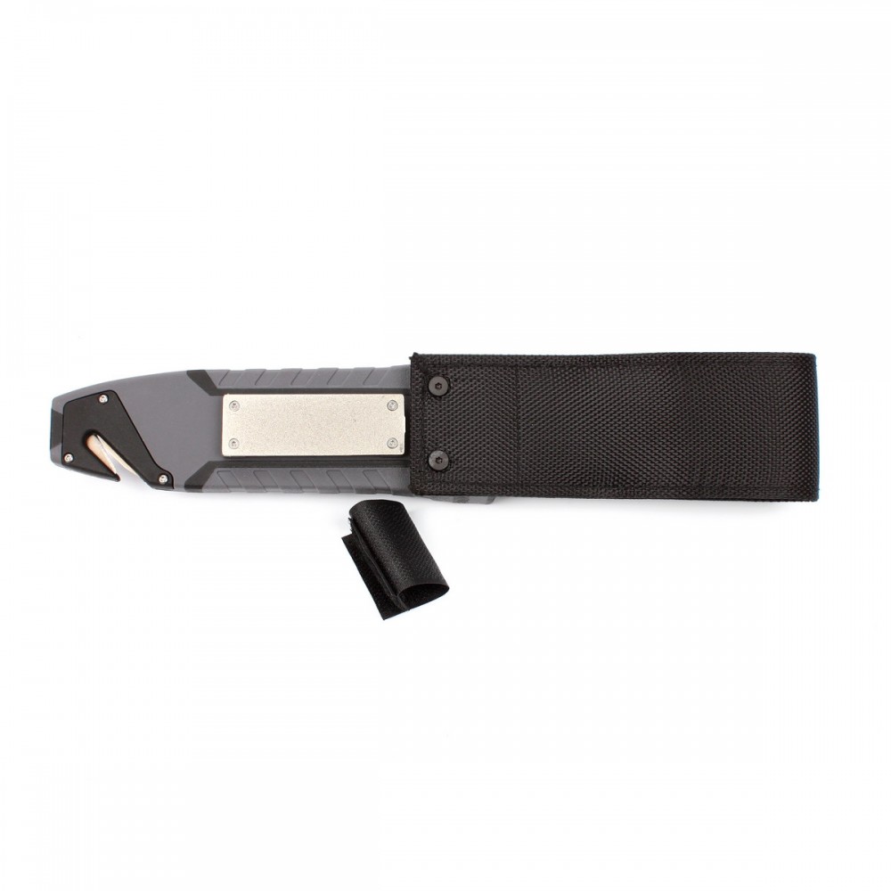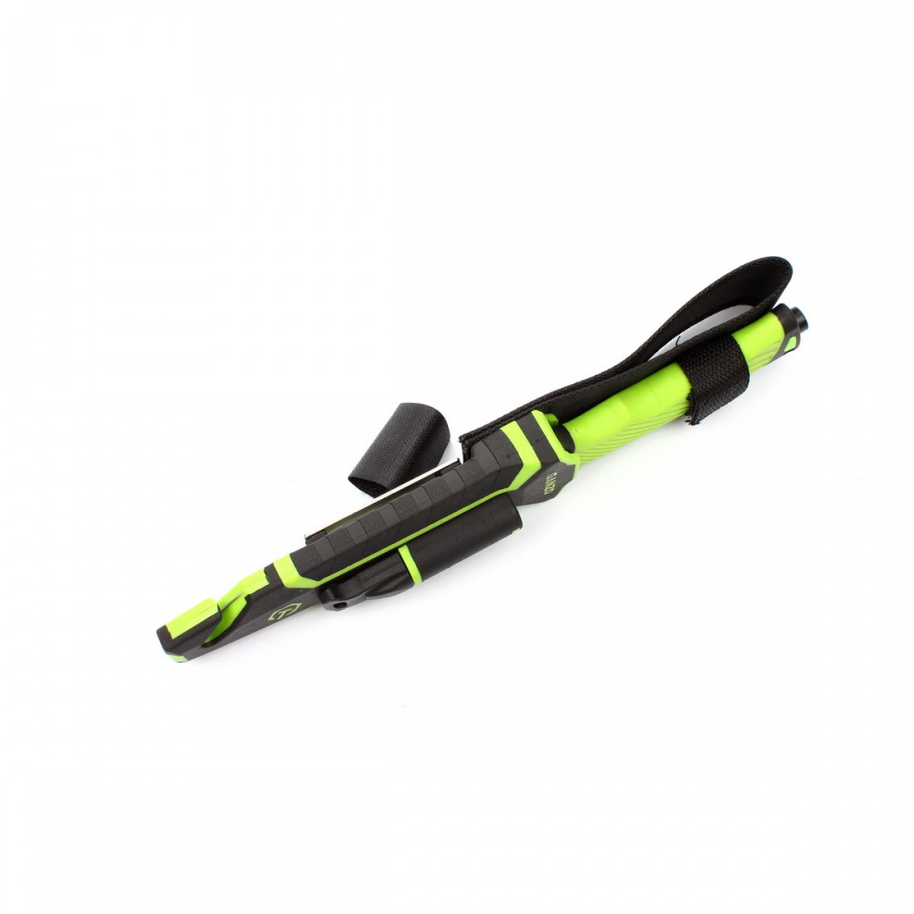 Рукоятка отлично приспособлена для удобной работы. Она сделана из термопластика с большим запасом прочности, а поверхность материала — прорезиненная, чтобы нож не ускользал из рук. Основной цвет рукоятки – черный, но отдельные элементы сделаны ярко оранжевыми, чтобы клинок был хорошо заметен на разных поверхностях. А чтобы найти его не составило труда даже в темноте, на рукоятке есть пара небольших светонакопительных элементов. В качестве дополнительного инструмента на торце рукоятки имеется небольшой стеклобой.