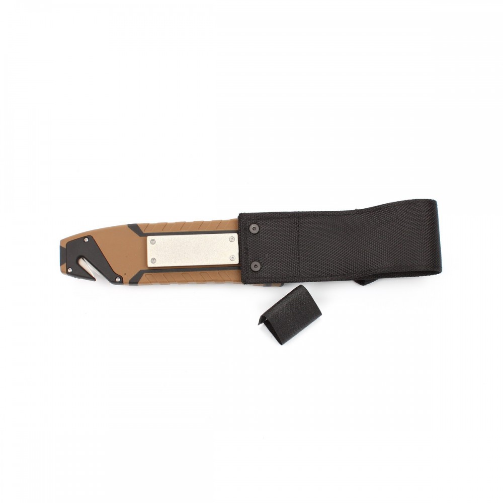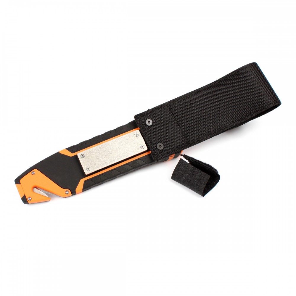 Рукоятка отлично приспособлена для удобной работы. Она сделана из термопластика с большим запасом прочности, а поверхность материала — прорезиненная, чтобы нож не ускользал из рук. Основной цвет рукоятки – черный, но отдельные элементы сделаны ярко оранжевыми, чтобы клинок был хорошо заметен на разных поверхностях. А чтобы найти его не составило труда даже в темноте, на рукоятке есть пара небольших светонакопительных элементов. В качестве дополнительного инструмента на торце рукоятки имеется небольшой стеклобой.