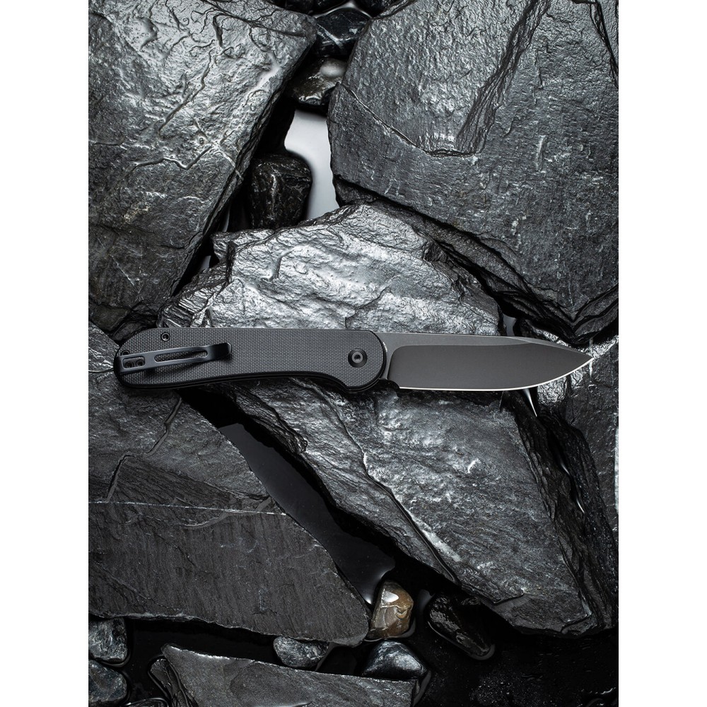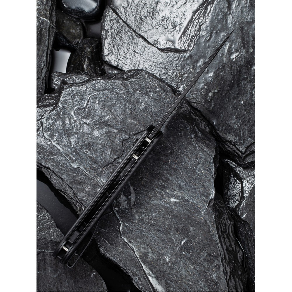 В основе клинка – сталь марки Sandvik 14C28N. Данный материал характеризуется стойкостью к коррозии и легко подвергается заточке. Это достаточно крепкая сталь. Рукоятка ножа изготовлена из прочного и устойчивого к повреждению материала G10. Он совмещает в себе стекловолокно и синтетическую смолу. Легкая текстура прекрасно лежит в руке и обеспечивает достаточный восторг. Модель имеет шариковые подшипники. Темное покрытие поверхности лезвия.