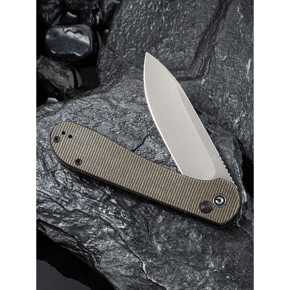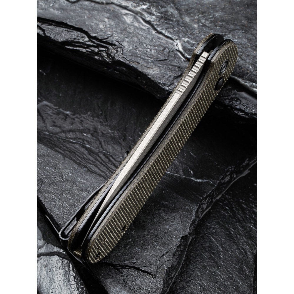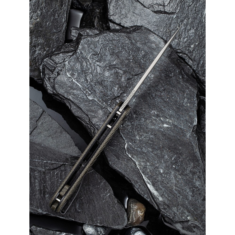 Рукоятка сделана с использованием микарты. Композитный материал из льна и синтетической смолы. Он выглядит великолепно и обеспечивает достаточное сцепление. Шариковые подшипники. Длина полного ножа достигает 21,3 сантиметра, в закрытом положении длина составляет 11,5 сантиметра. Длина лезвия: 8,9 сантиметра, а толщина равняется трем миллиметрам. Весит модель 95 грамм.