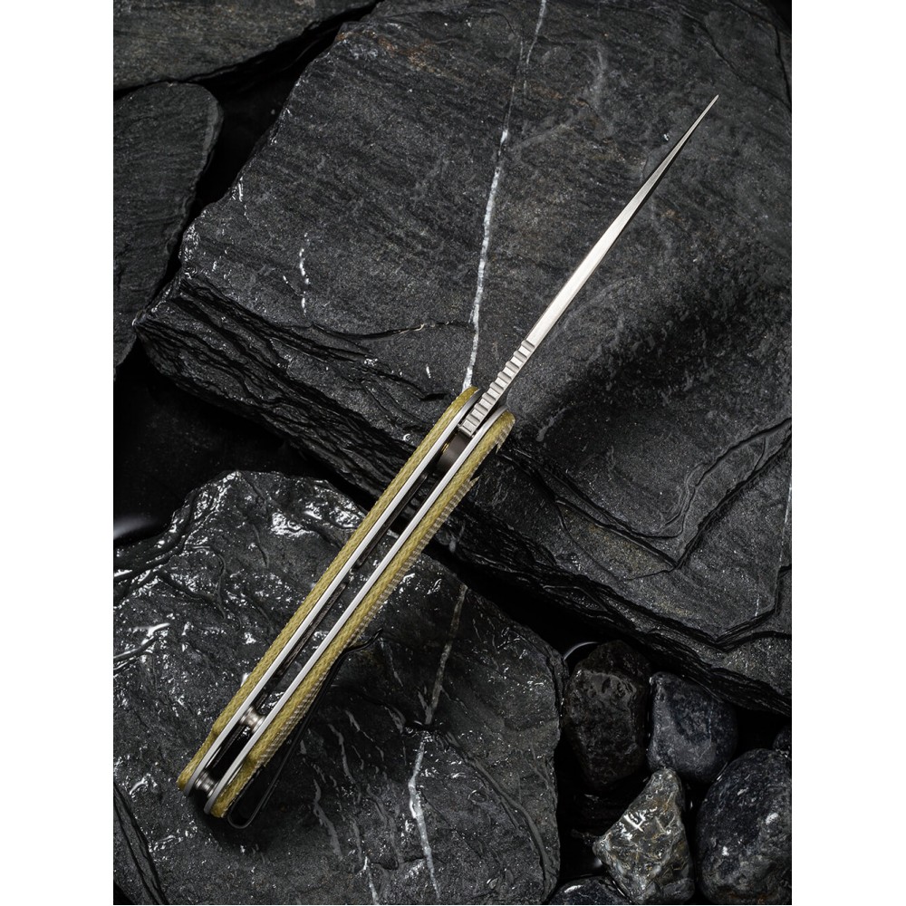 Рукоятка модели выполнена из микарты. Это композитный материал из льна и синтетической смолы. Он выглядит отлично и гарантирует достаточное сцепление. Таким образом, управлять ножом очень просто. Он устойчив к интенсивным нагрузкам.