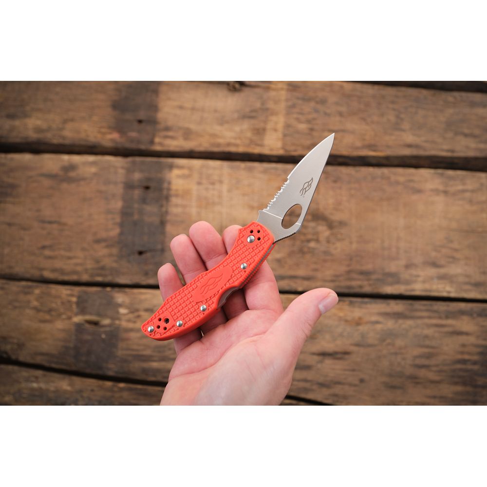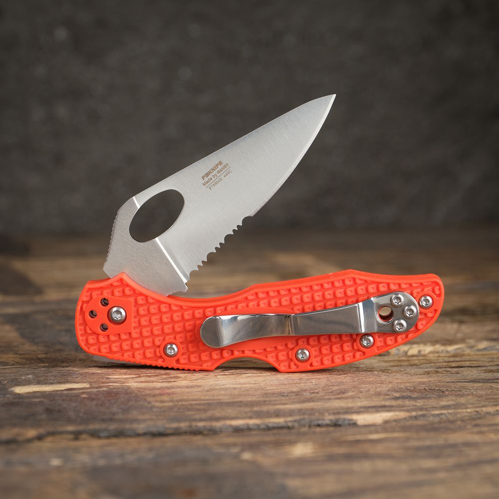 Клинок данной модели имеет комбинированное лезвие: половина лезвия ближе к основанию имеет серрейторную заточку, а вторая половина – прямую заточку. Классическая прямая заточка – это универсальное лезвие для большинства повседневных задач, в которых необходим ровный рез, в то время как серрейтор отличается более длительным удержанием остроты и предназначен для выполнения специфических задач. Зубчатая кромка эффективно справляется с реза волокнистых материалов, таких как стропы, веревки и канаты, а также позволяет быстро срезать мелкие ветки или заточить деревянные колья.