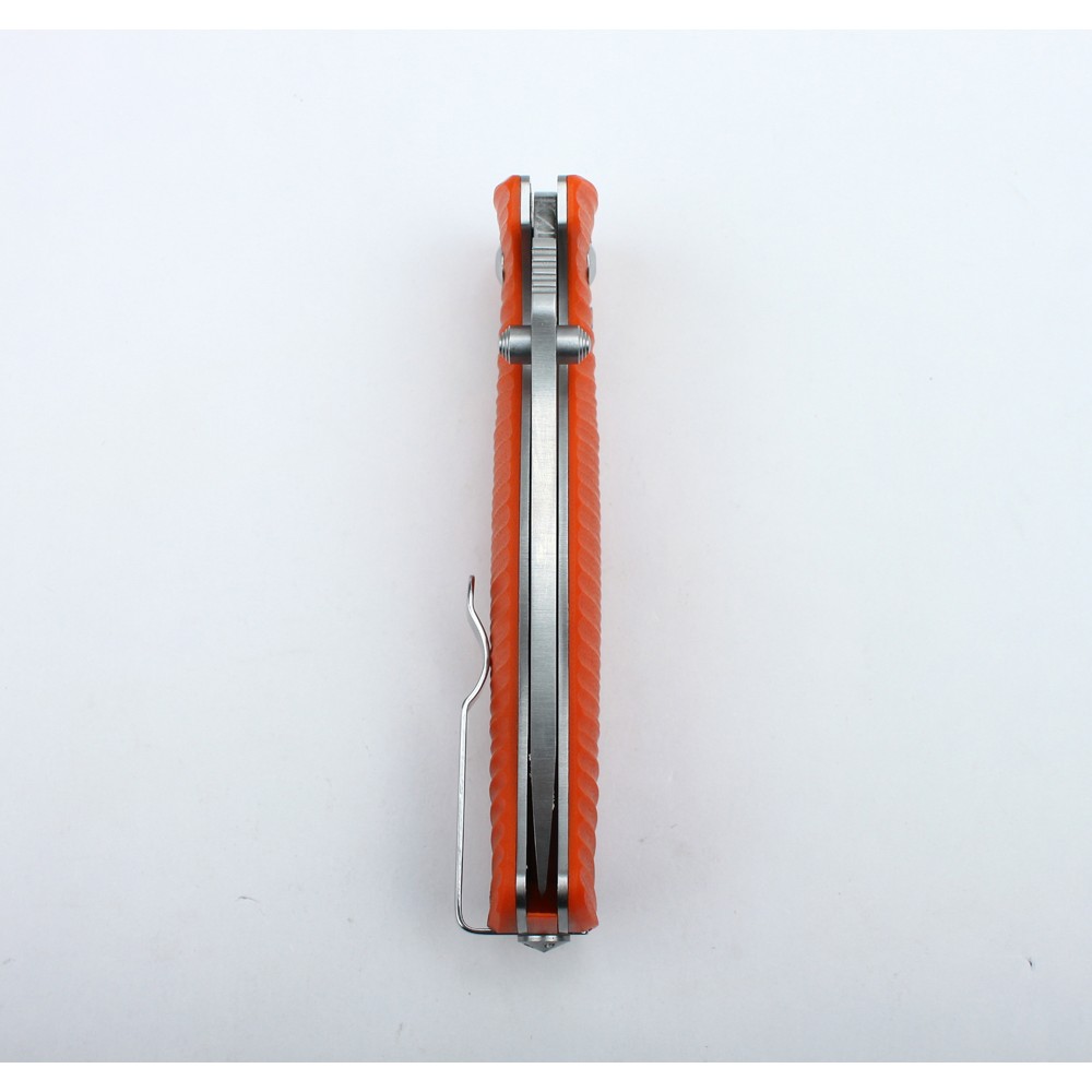 Для накладок на рукоятку ножа производители использовали современный вид пластика высокой прочности под названием G10. По сути, он представляет собой композитный материал из эпоксидных смол и стеклоткани. Этот материал обладает высокой прочностью, хорошо выдерживает ушибы, противостоит влаге и долгое время сохраняет яркий цвет. Рукоятка ножа Ganzo G720 неровная. Такая форма одновременно играет роль элемента дизайна и способствует надежному удержанию.