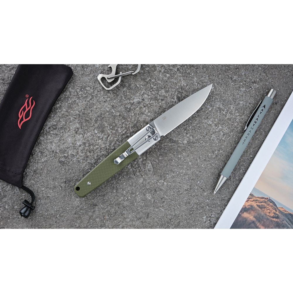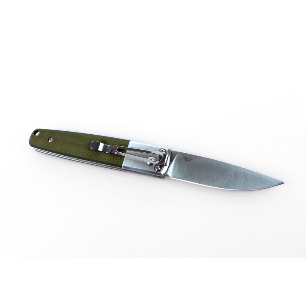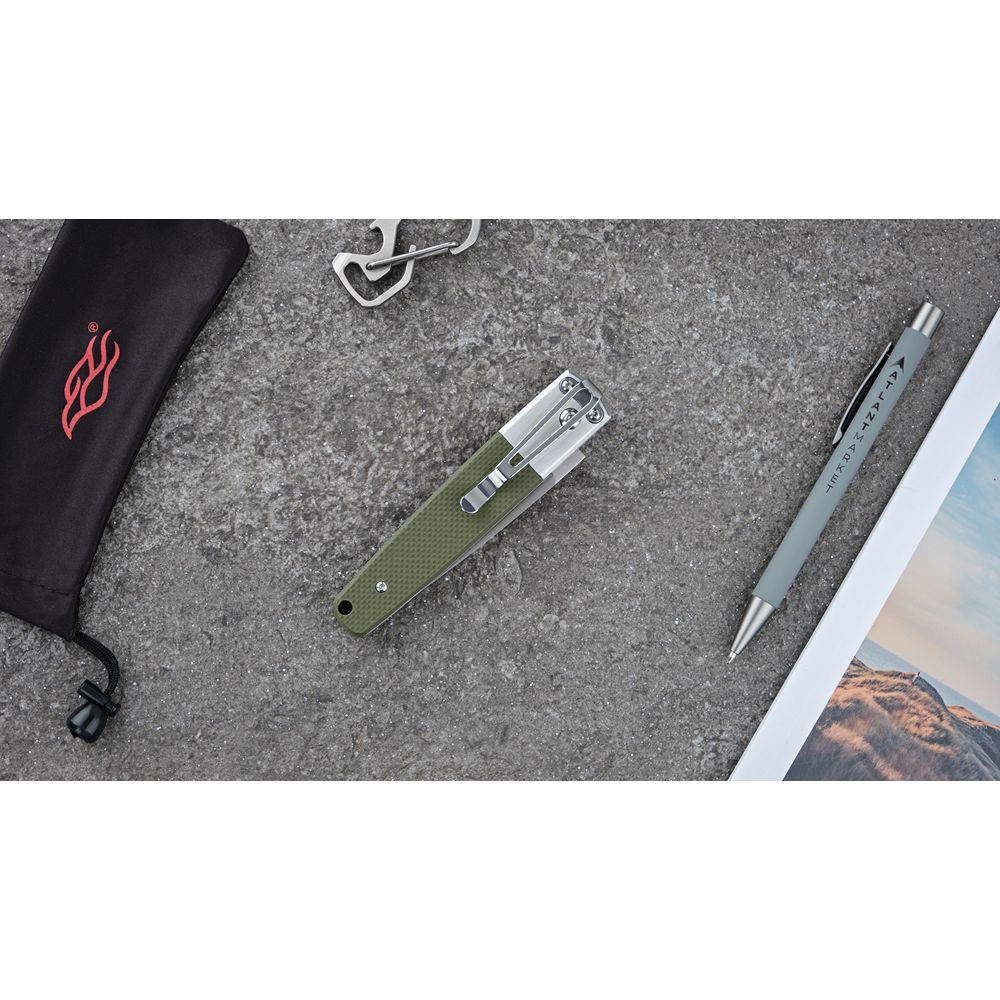 Рукоятка также частично сделана из стали. Второй используется для нее материал – современный полимер G10. Это очень крепкое и долговечное композитное волокно. Поверхность рукоятки – текстурированная, улучшающая ее сцепление с ладонью. На внутренней стороне расположена металлическая клипса для подсоединения к поясному ремню или фиксации в кармане. Эта небольшая деталь позволяет держать нож под рукой и не потерять его.