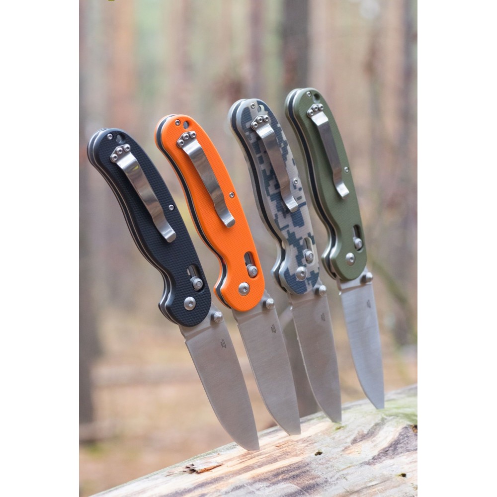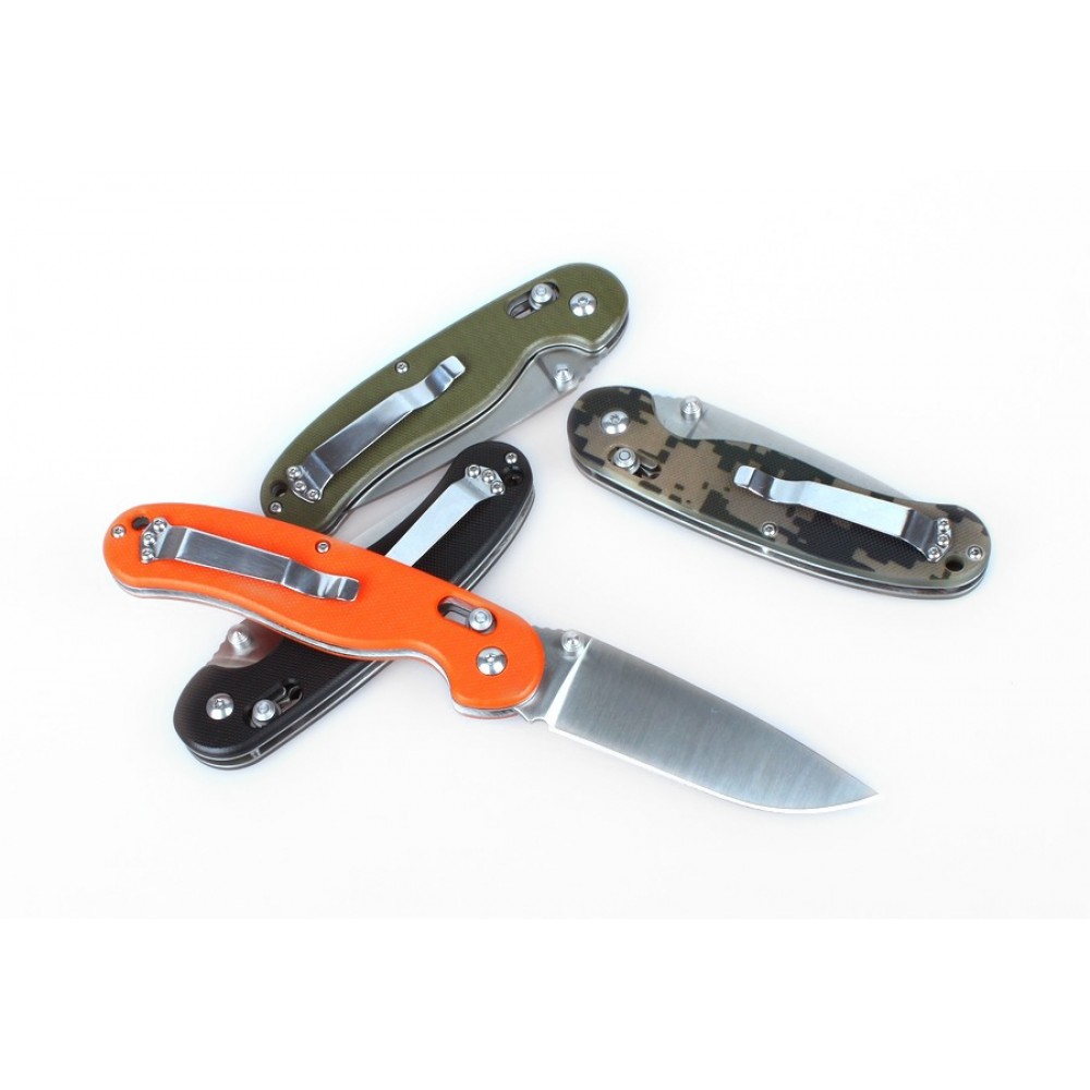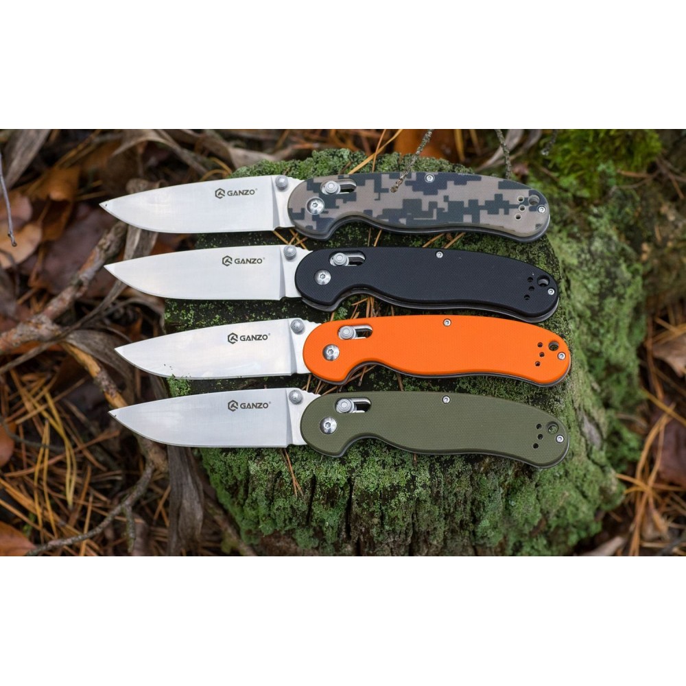 Рукоятка каждого ножа Ganzo 727m облицована накладками из стеклопластика G10. Это современный композитный материал с высокими показателями износостойкости и способностью выдерживать влияние многих химически активных веществ. Для выбора доступны четыре цветовых варианта рукоятки: черный, оранжевый, болотно-зеленый и камуфляжный, независимо от цвета, поверхность любой рукоятки текстурирована, чтобы его можно было крепче держать в руках. Кроме того, производители предусмотрительно разместили на рукоятке клипса для крепления ножа на ремень и отверстие для протягивания темляка.