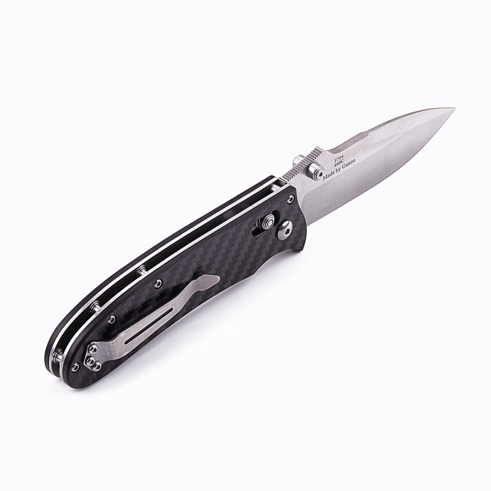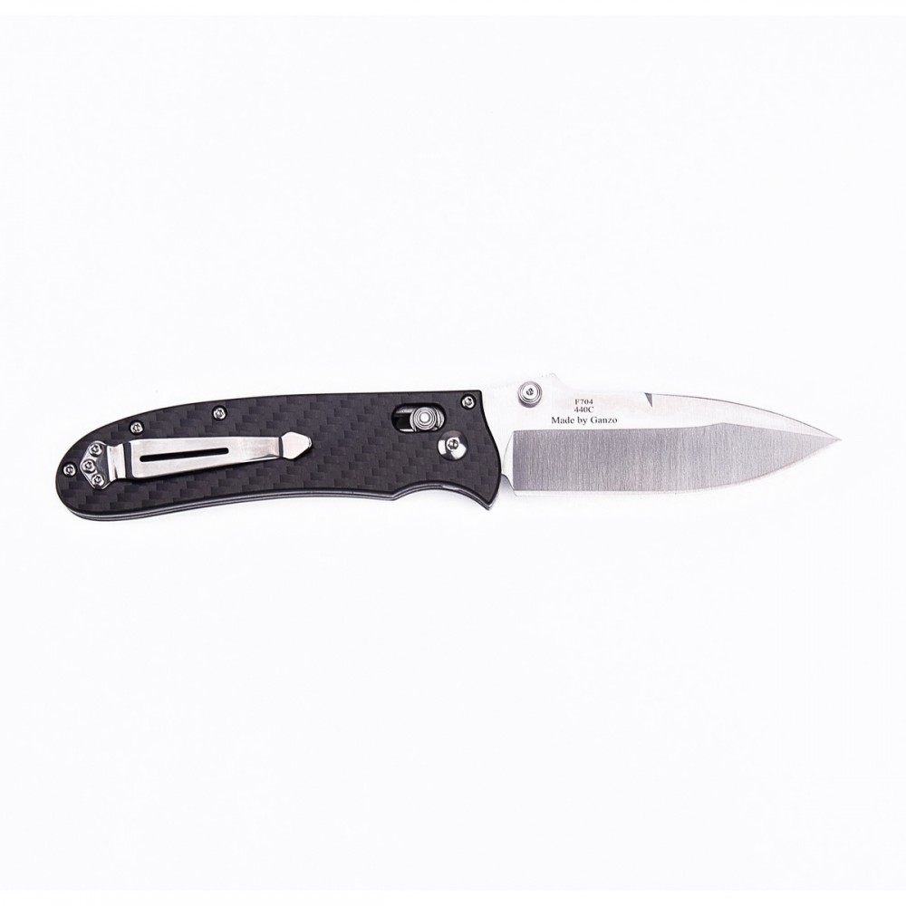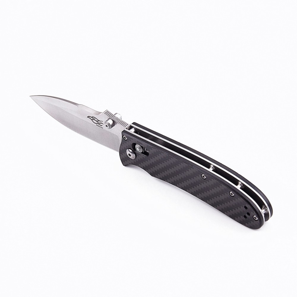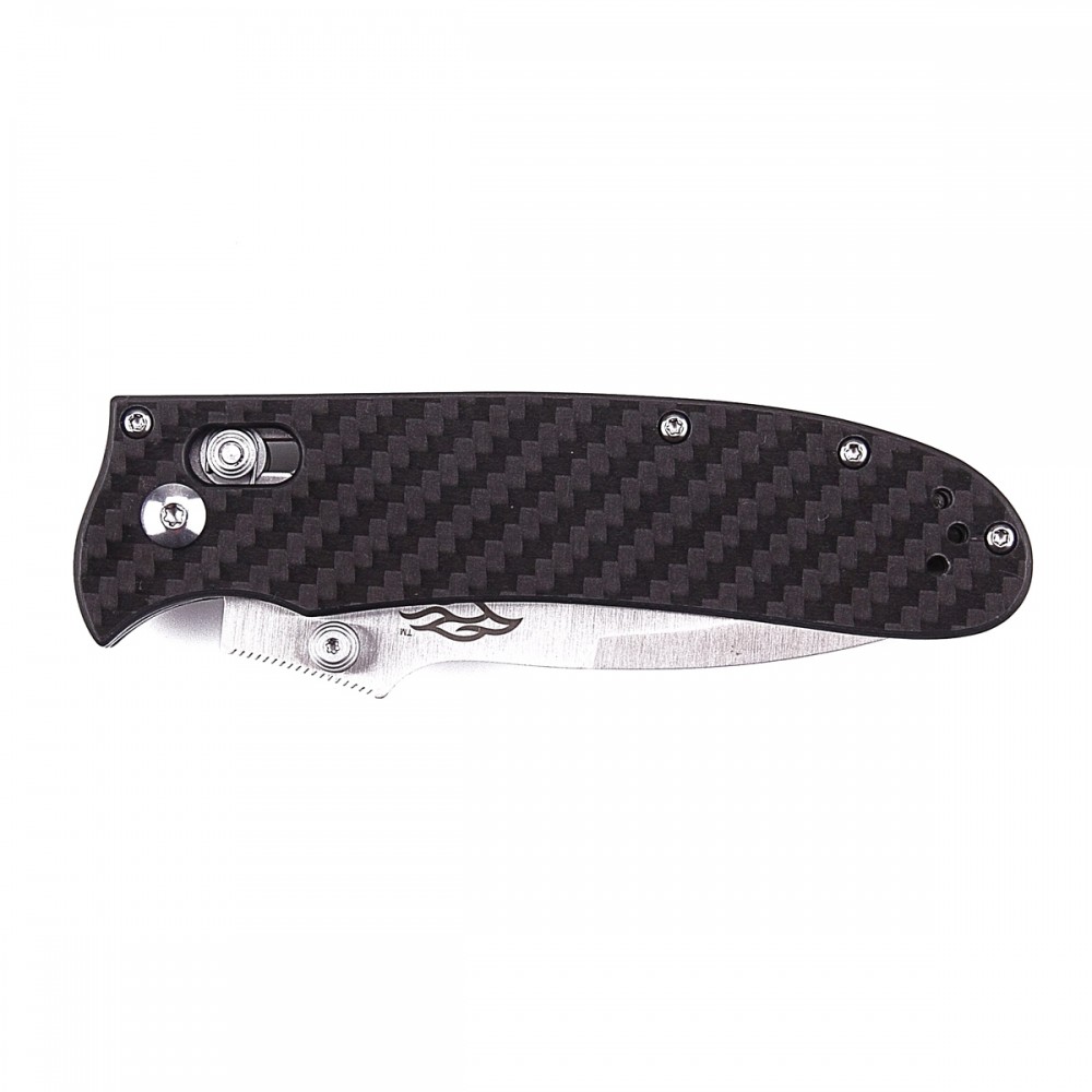 F7041-CF от Ganzo стильно смотрится, но при этом практически идеально сбалансирован. В рабочем положении его длина составляет 20 сантиметров, лезвие – 8,5 см. На обухе есть особые насечки, предназначенные для рабочего пальца, что значительно повышает удобство работы и сцепления.
