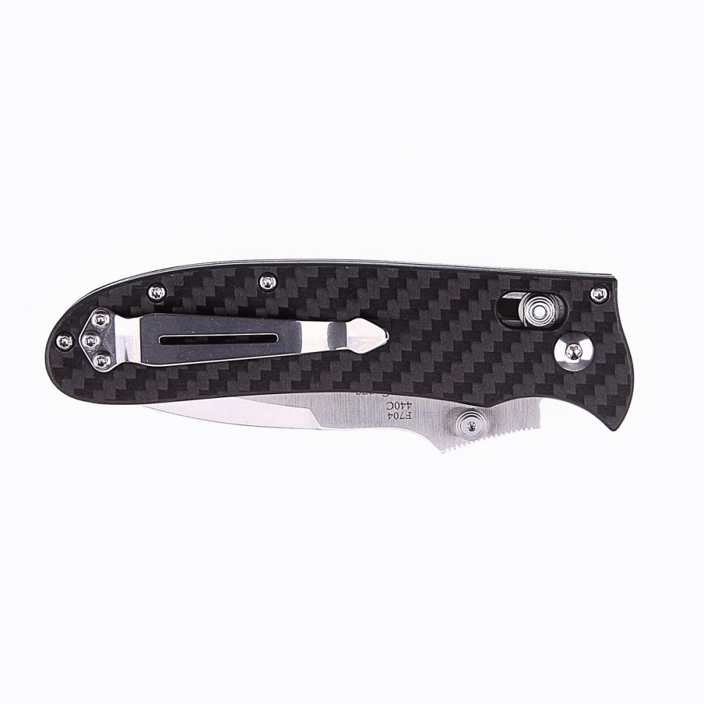 Нож F7041-CF сразу понравился всем, как только появился на рынке. Он универсален и прочен, производитель продумал каждый пустяк. Форма клинка классическая – drop-point, с приспущенным к острию обухом. Изготавливается из высококачественной стали 440С с твердостью 58 HRC. Фиксирует клинок в закрытом и открытом положении механизм G-Lock, показывающий высокую надежность.