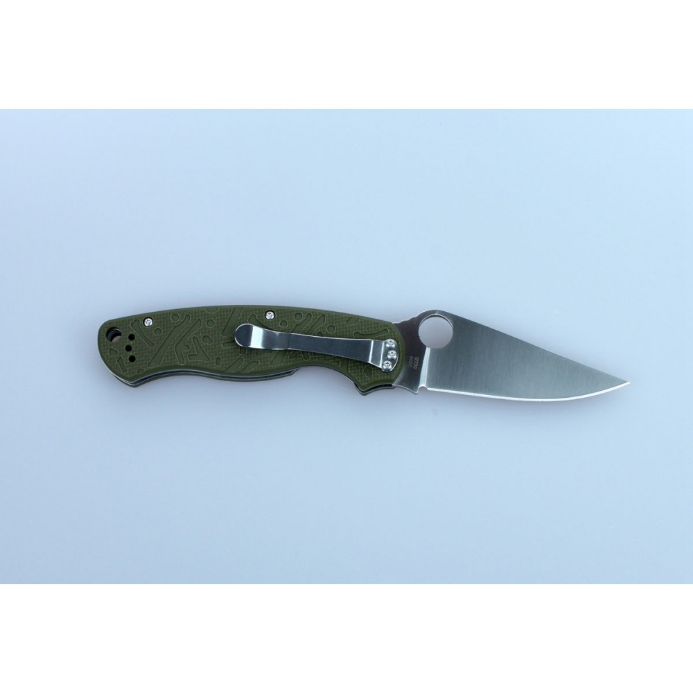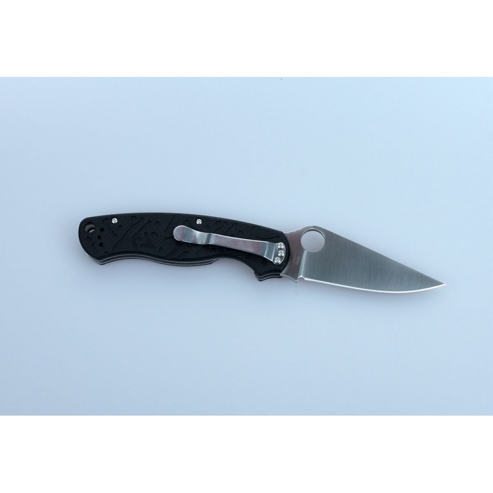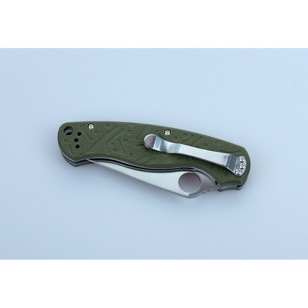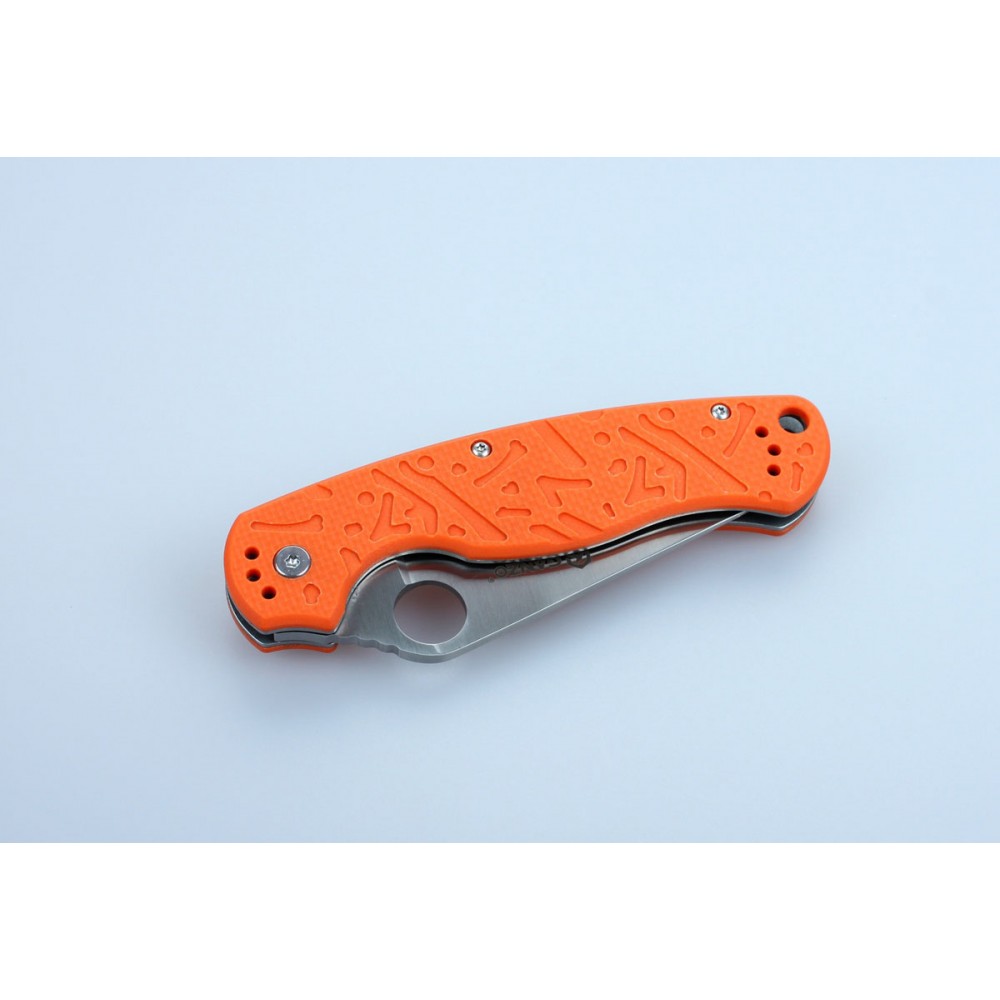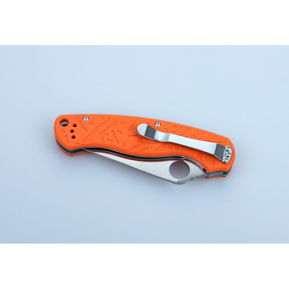 Рукоятка изготовлена из качественного композитного пластика, состоящего из стекловолокна и эпоксидных смол. Этот материал наделен большой долговечностью, способностью противостоять коррозии и механическим деформациям. Для выбора доступны три варианта – с ручкой черного, зеленого или оранжевого цвета. На ее поверхность нанесен фактурный рисунок, способствующий тому, чтобы нож не скользил даже во влажных ладонях. Кроме того, на рукоятке сделано небольшое сквозное отверстие для закрепления страховочного ремешка на руку и расположена металлическая клипса для фиксации ножа в кармане.