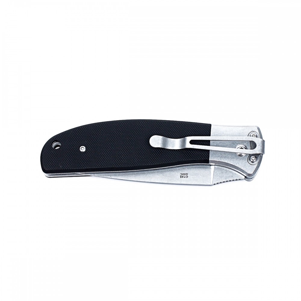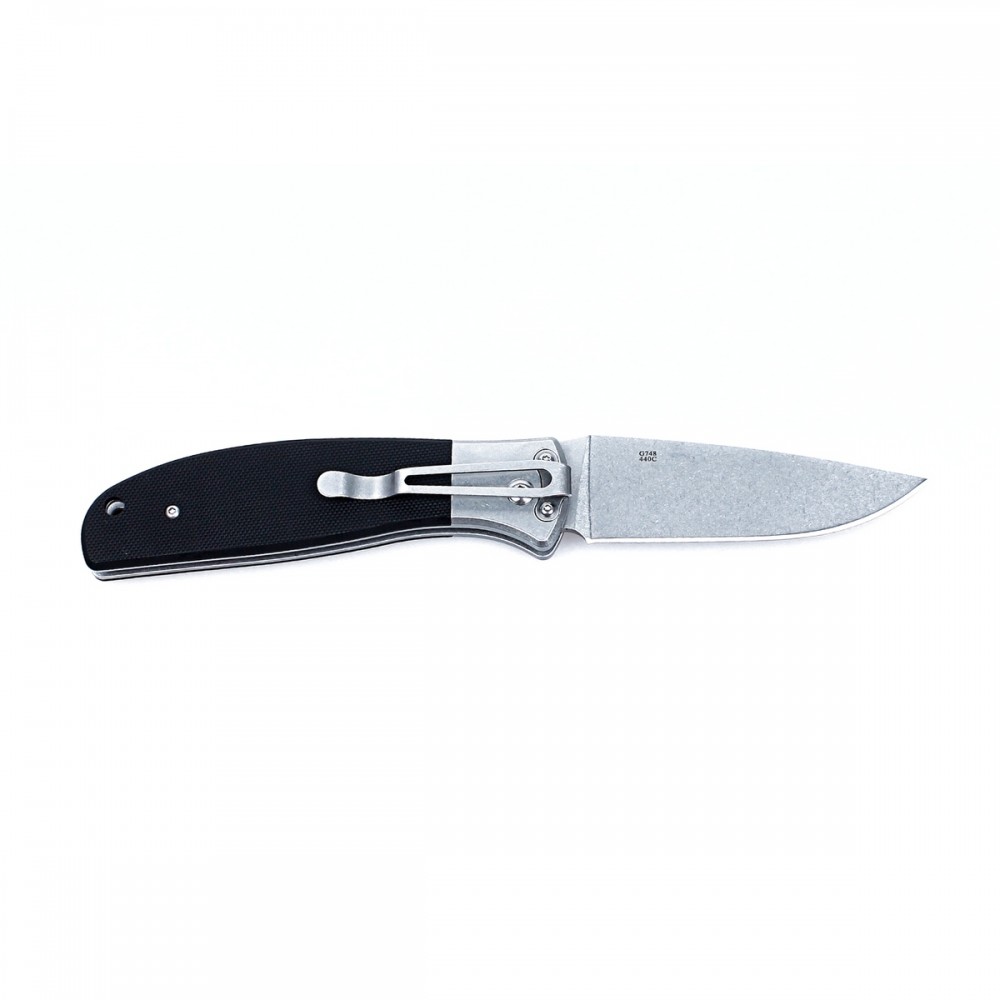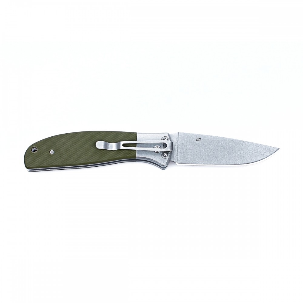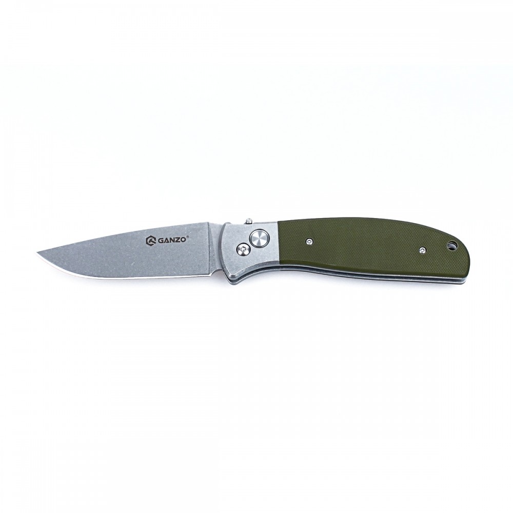 Компанія Ganzo продовжує випускати зручні і красиві складні ножі. Модель Ganzo G7482 орієнтована на потреби туристів, любителів полювання і рибалки. Це практичний ніж з нержавіючим клинком. Він виконаний з якісної за своїми характеристиками марки сталі 440С. Це нержавіючий метал з досить високою твердістю, щоб зроблений з нього ніж міг довго зберігати гостроту заточки. До речі, лезо цілком заточене гладко. Цей тип заточення ще називають plain. Він оптимально підходить для розрізання продуктів харчування, будь-яких інших матеріалів з однорідною структурою. Крім того, форма клинка така, що на його кінці є гострий кінчик, який зручно використовувати для невеликих точних надрізів. Розмір по довжині клинка дорівнює 8,9 див. При цьому, товщина дорівнює 3 мм, що також підвищує міцність ножа. Адже лезо такої товщини підходить для роботи з твердими матеріалами. Поверхня ножа блищить на сонці, але не є повністю глянцевою на сонці, оскільки метал відшліфований жорсткими матеріалами, які залишили на його поверхні дрібний штриховий узор.