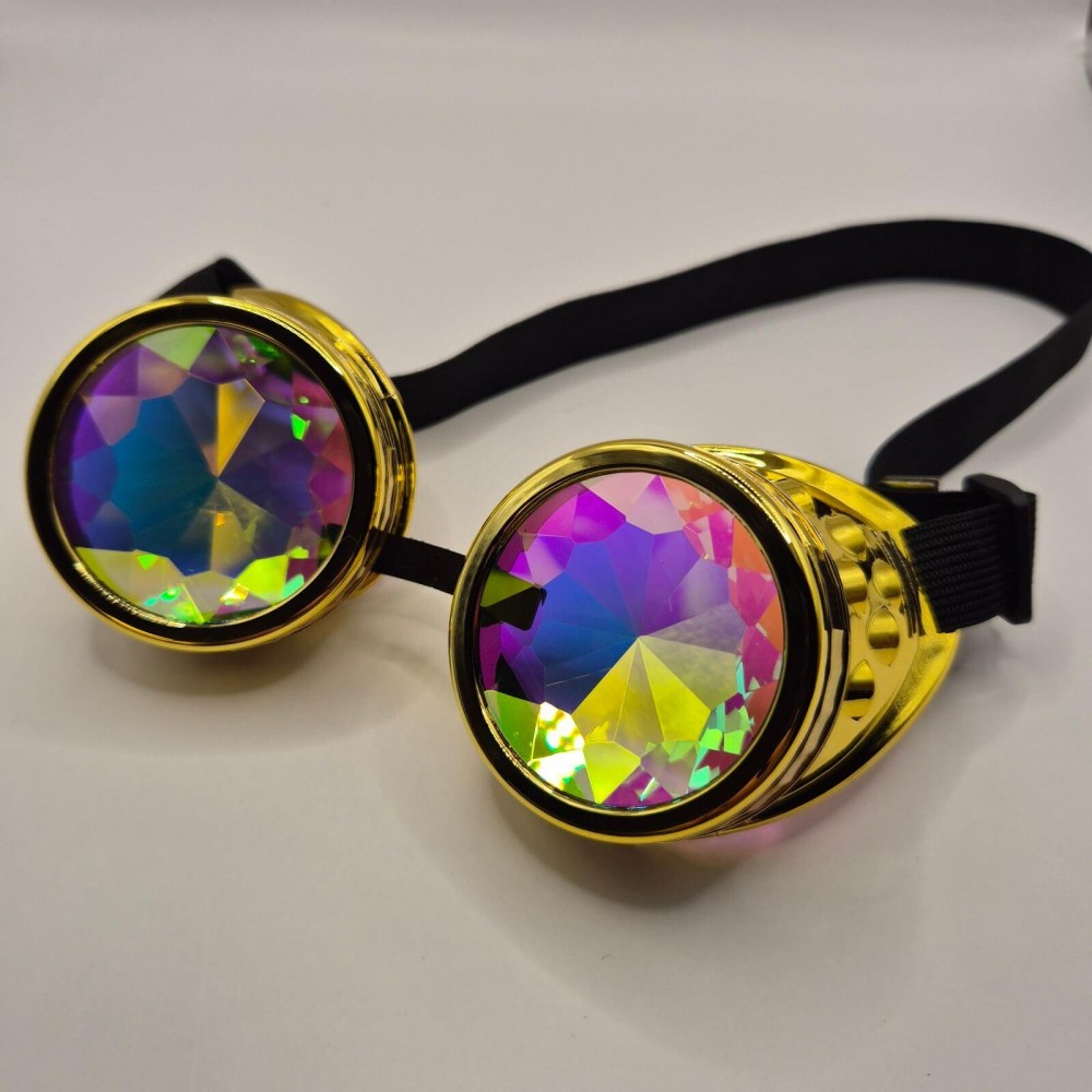 Эти очки в стиле стимпанк — словно магия, воплощённая в металле и стекле. Золотая оправа из прочного ABS-пластика блестит, как луч солнца в индустриальном небе. А линзы-калейдоскопы, выполненные из кристаллического материала, преломляют свет, превращая мир вокруг в праздник цвета. Размер — 170×60 мм. Окружность регулируется, а линзы можно сменить.