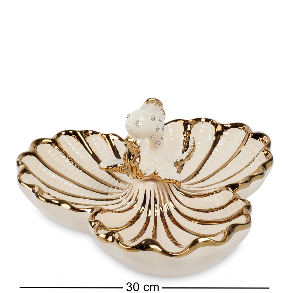 Менажница "Золотая Рыбка" (Art Ceramic); Это необыкновенное блюдо собой представляет менажницу, поскольку в три различные его секции можно положить разную еду, не смешивая ее отдельные виды между собой. Но выглядят эти секции как раскрывшиеся створки диковинной раковины, над которыми на гребне волны взлетела вверх золотая рыбка, усыпанная блестящими вставками, копирующими чешую.