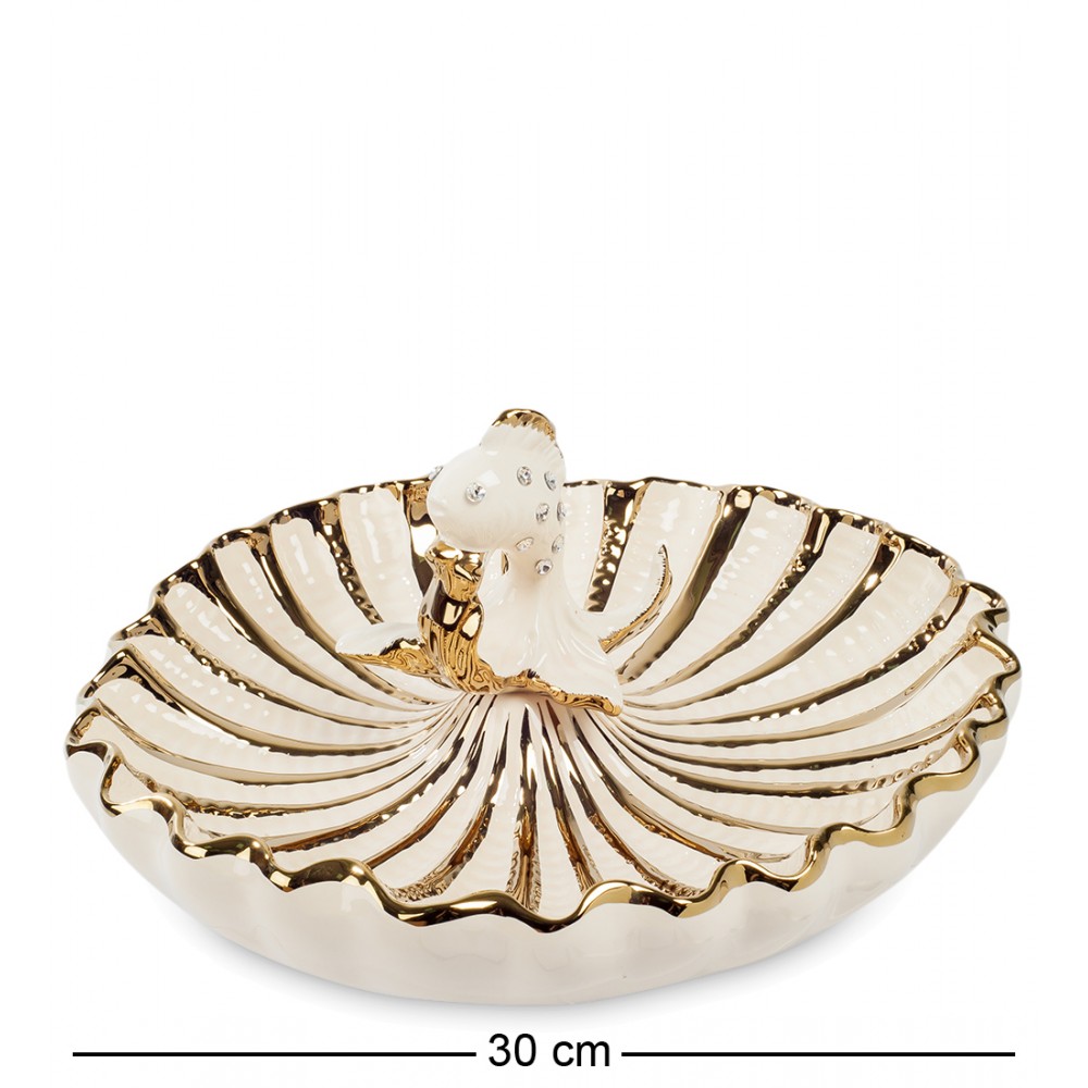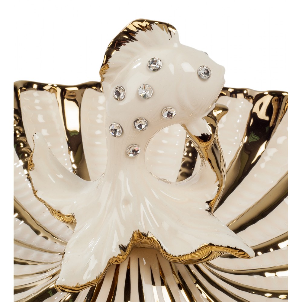 Блюдо "Золотая Рыбка" (Art Ceramic); Над бело-золотой поверхностью волнистой формы большой морской раковины, в самом ее центре развернул собственные лепесточки необыкновенный цветок, из середины которого как бы выплывает волшебная Золотая Рыбка. Ее белое фарфоровое тело украшено сверкающими кристаллами, спинной плавник отделан золотом.