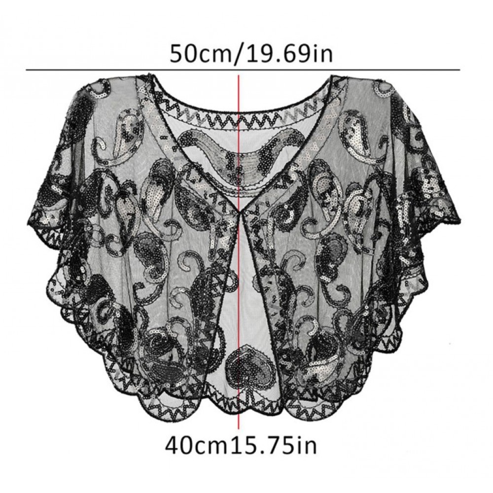 Стильная чёрная пелерина с пайетками создаёт эффектный ретро-образ в стиле 1920-х. Лёгкая, воздушная и удобная в носке, она дополняет костюм Гэтсби, образ для маскарада, танцевального шоу или тематической фотосессии. Модель выполнена из сетчатой ткани и украшена блестящим узором. Универсальный размер подходит большинству фигур.