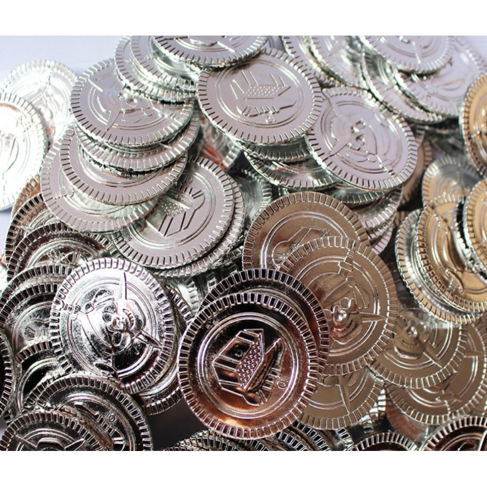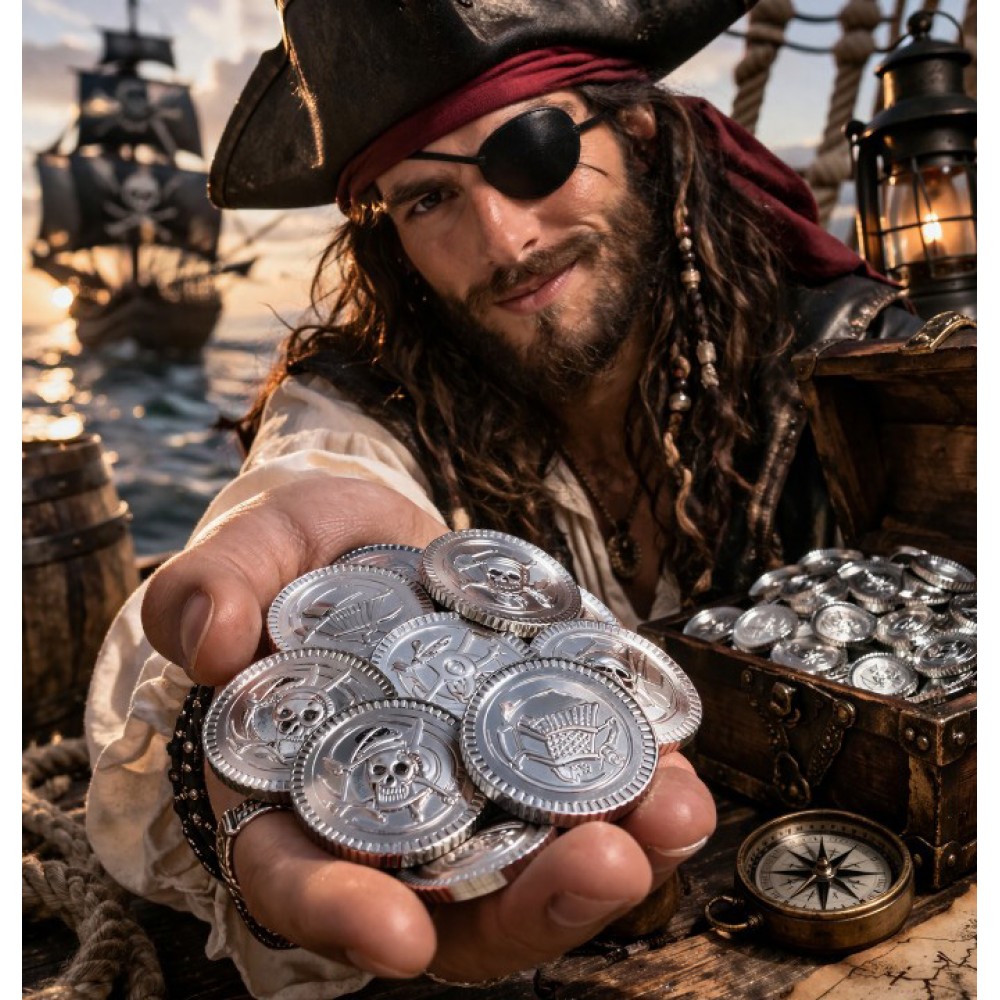 Серебряные пиратские монеты — отличный вариант, если хочется чего-то более необычного, чем классическое золото. Они смотрятся стильно и немного «холоднее» по настроению, идеально заходят под тематические вечеринки, фотозоны или квесты.