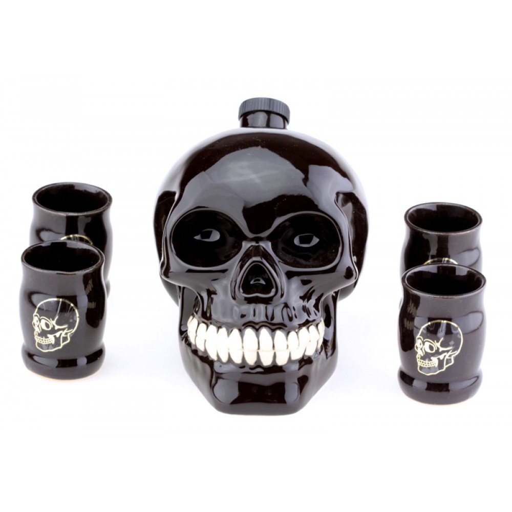 Необычный подарочный набор, состоящий из графина черепа и четырех керамических рюмок с черепами на борту.Рюмки вмещают по 50 грамм каждая.Графин череп – прикольный подарок