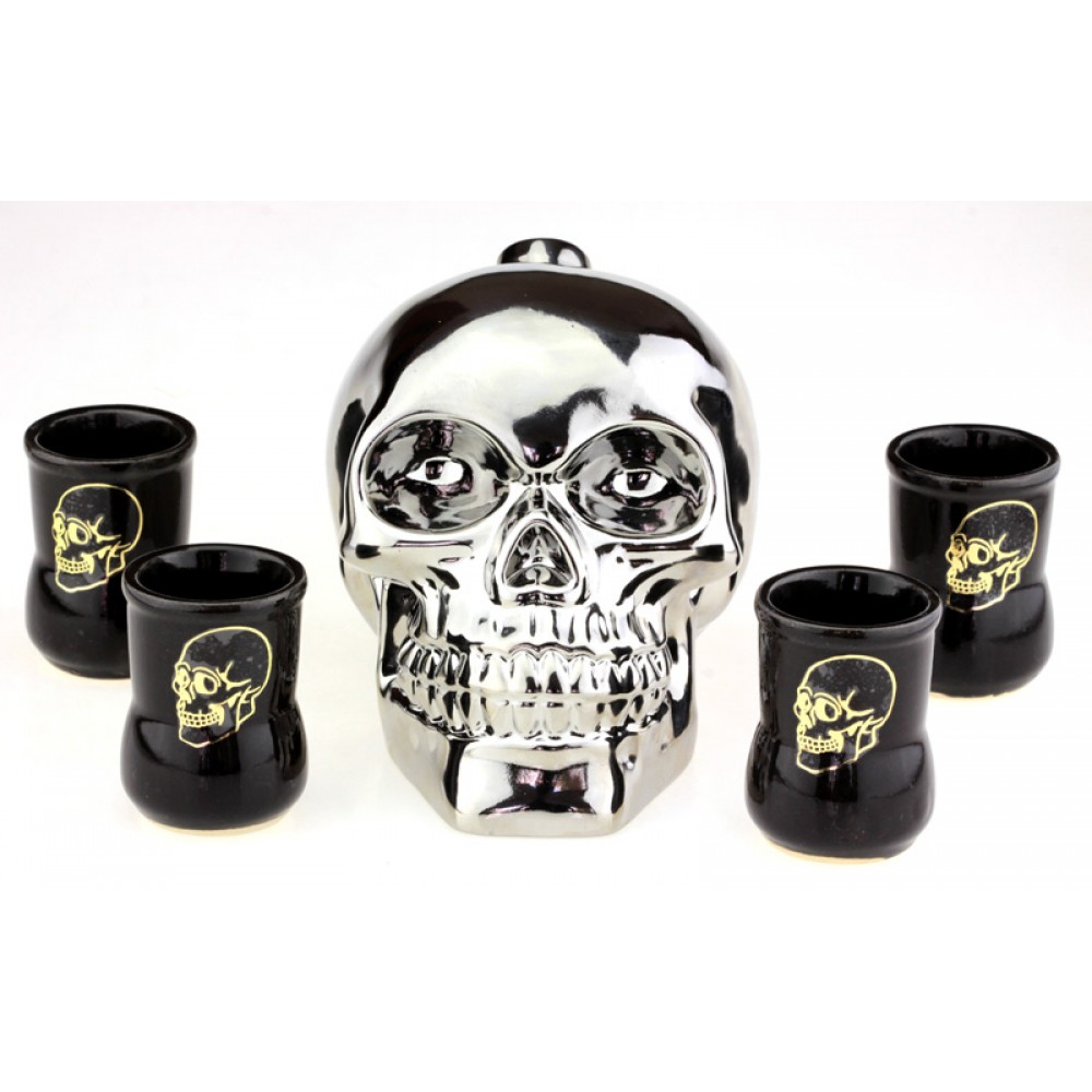 Необычный подарочный набор, состоящий из графина черепа и четырех керамических рюмок с черепами на борту.Рюмки вмещают по 50 грамм каждая.Графин череп – прикольный подарок