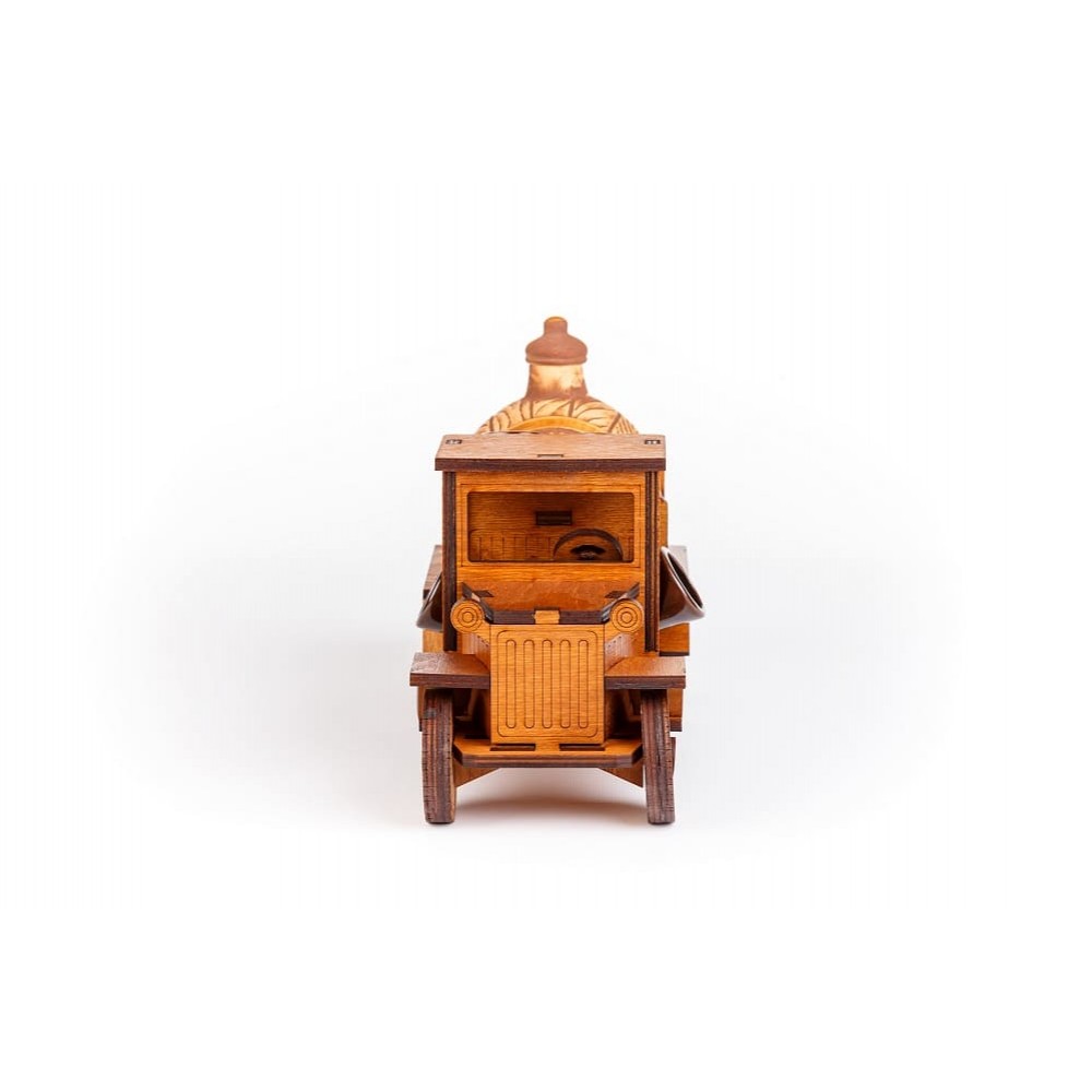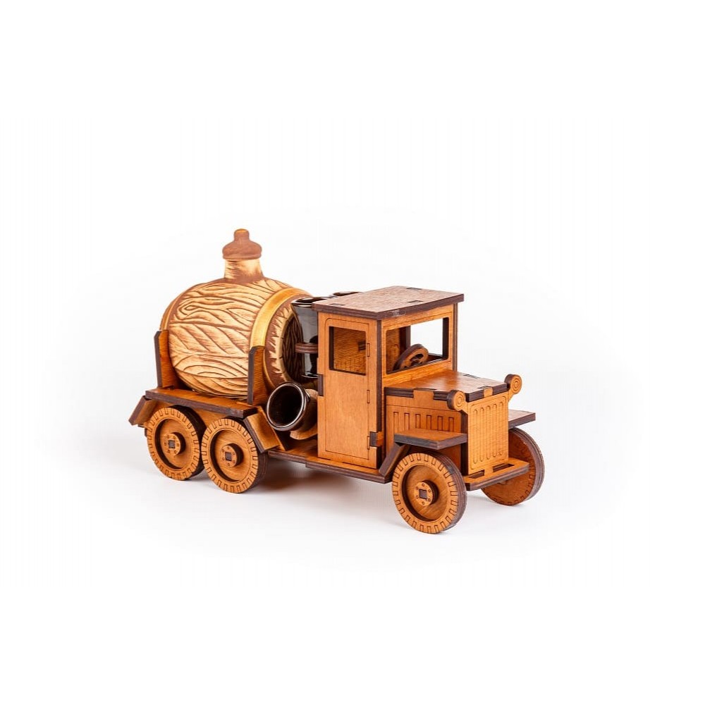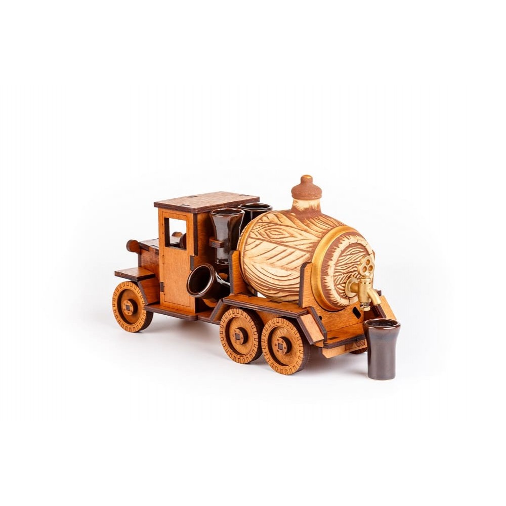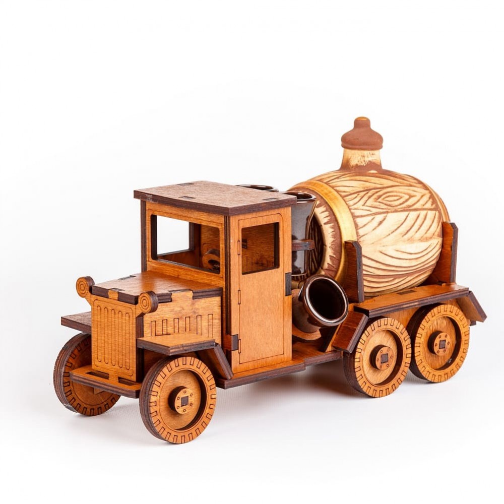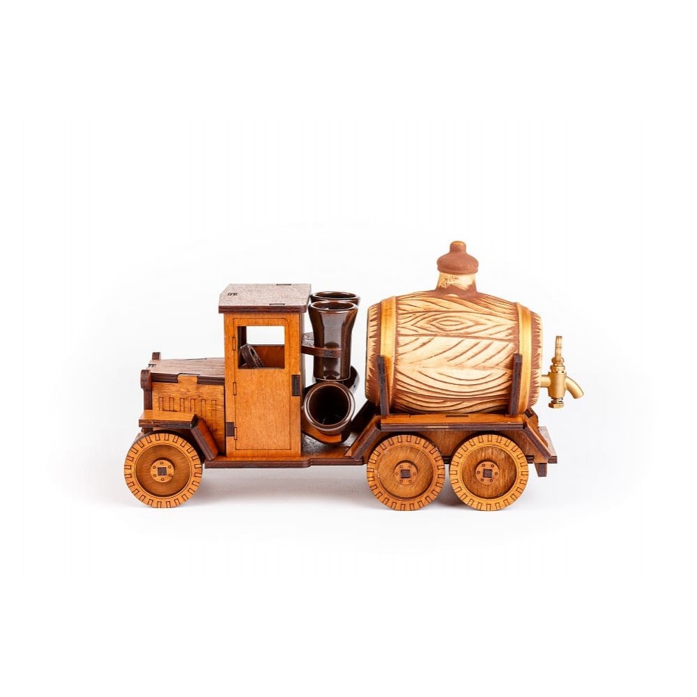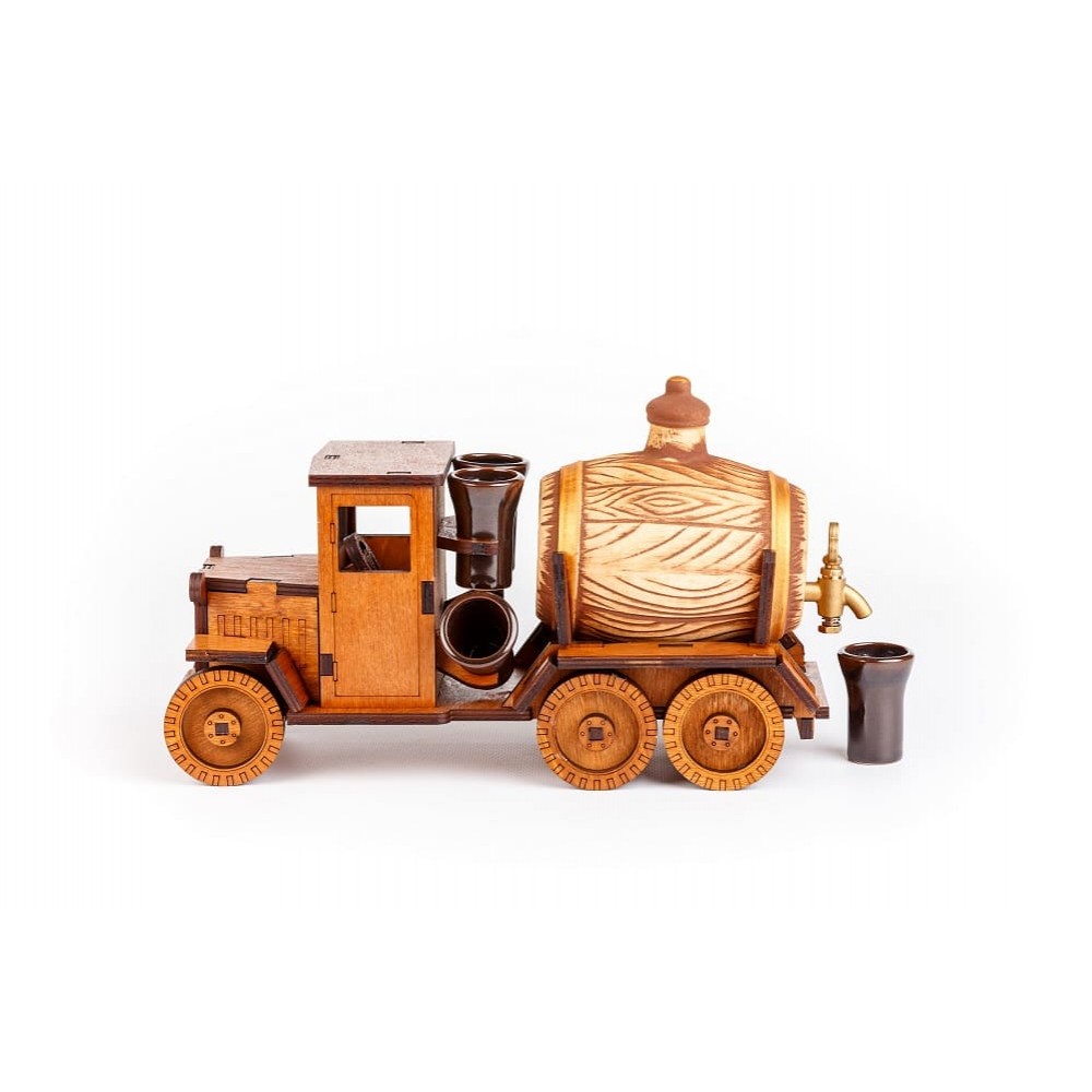 Деревянный грузовик с керамической бочкой, дополненный краником для удобного разлива крепких напитков.