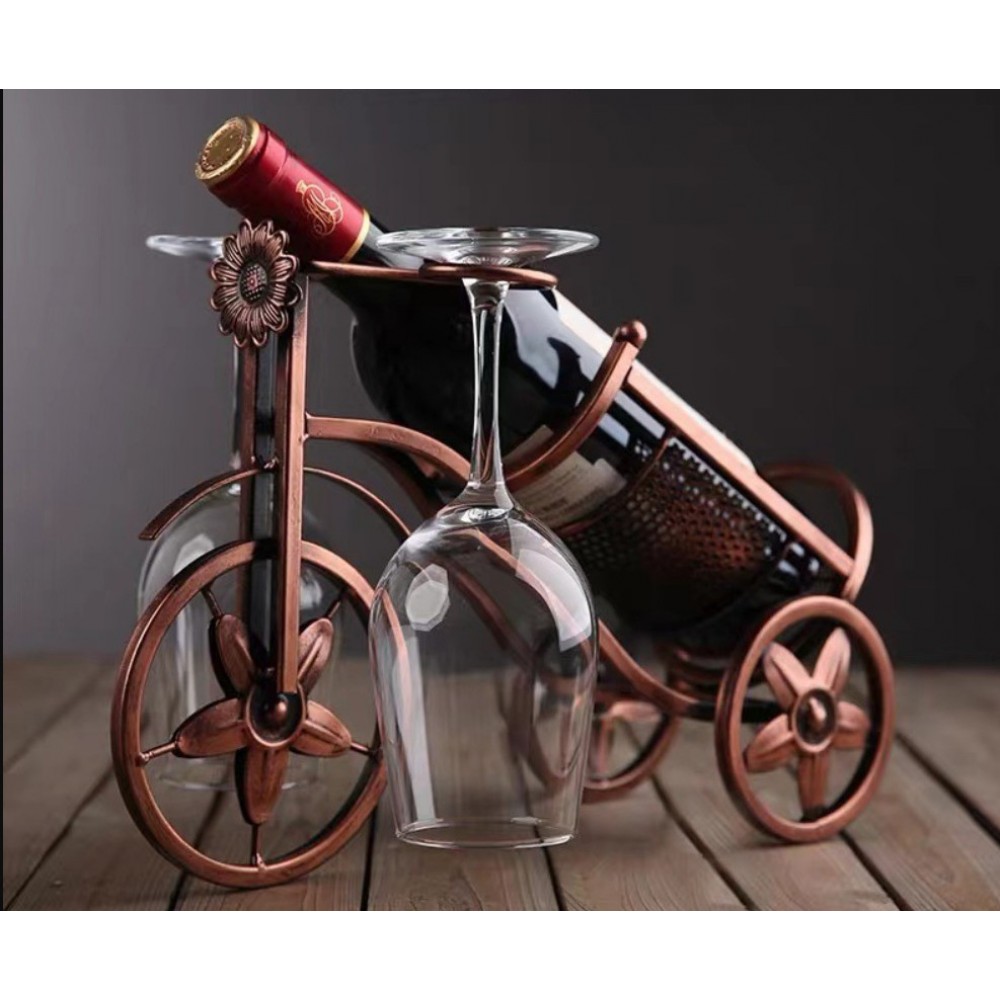 Декоративная подставка для вина в виде ретро-велосипеда с держателями для 2 бокалов — стильный и функциональный арт-объект для домашнего бара, кухни или гостиной. Три колеса с лепестковыми спицами, декоративный цветок на руле и плетёная корзина для бутылки создают атмосферу уютного европейского винтажа.