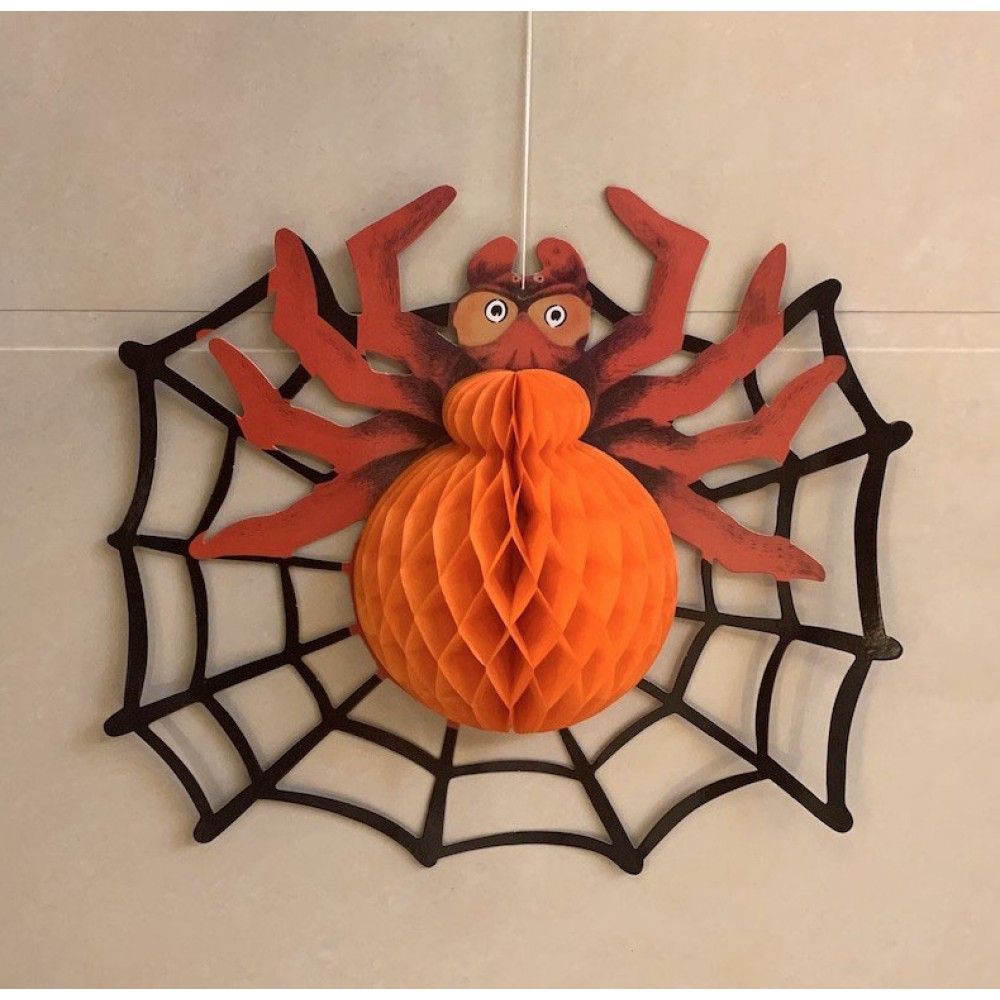 Этот декор на Хэллоуин моментально задаёт атмосферу: чёрная паутина и объёмный оранжевый «соты»-живот у паука привлекают внимание издалека и круто смотрятся в кадре. Подвеска лёгкая, собирается за минуту: раскройте бумажный элемент-соты, зафиксируйте липучкой и повесьте за шнур. Никаких инструментов — декор на Хэллоуин готов украсить вход, стену, окно или фотозону.