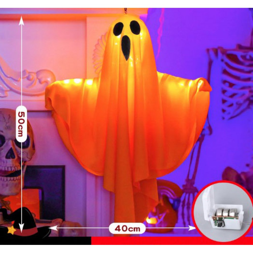 Размер 50×40 см делает привидение достаточно крупным, чтобы его было видно издалека, но при этом оно остаётся лёгким и удобным для подвешивания. При необходимости украшение можно быстро снять, свернуть и хранить до следующего праздника — ткань не мнётся и не теряет цвет даже при многократном использовании.
