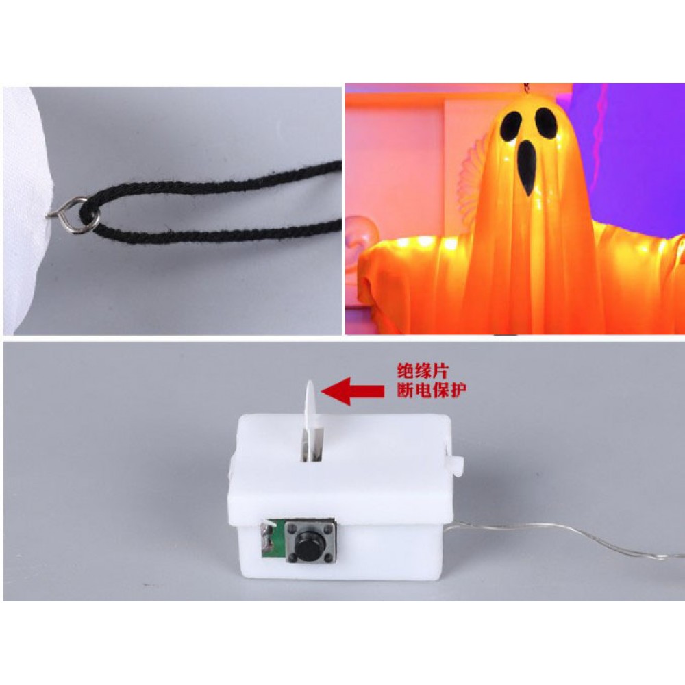 Фигурка выполнена из лёгкой ткани, приятной на ощупь, а глаза из чёрного фетра придают образу классического хэллоуинского призрака. Благодаря встроенным светодиодам и автономному питанию от трёх батареек LR44, декор не требует проводов и может использоваться где угодно — на улице, балконе, окне или у входа в дом.