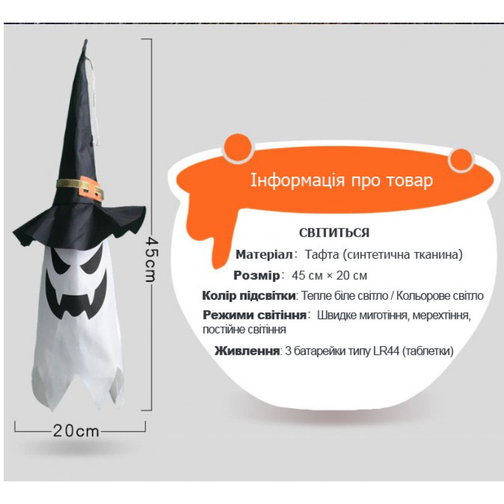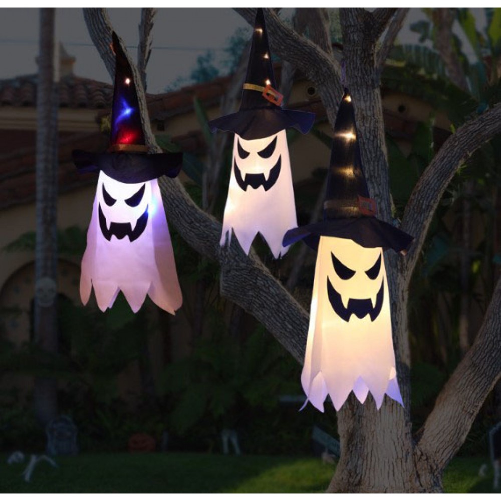 Подвесное привидение с подсветкой в шляпе ведьмы — декор для Хэллоуина
