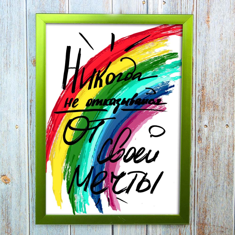 Постер мотиватор 56359 НИКОГДА НЕ ОТКАЗЫВАЙСЯ ОТ СВОЕЙ МЕЧТЫ А4 продолжает подборку оригинальных картин мотивирующих на работу. Картина мотивирующий постер в рамке имеет надпись НИКОГДА НЕ ОТКАЗЫВАЙСЯ ОТ СВОЕЙ МЕЧТЫ ! мотивирует на позитив и веру в свои силы, что ты все сможешь не смотря ни на что. Изображение радуги символизуруе о том, что нет ничего невозможного в жизни и все в твоих руках.. Постер можно повесить на стену либо любую другую поверхность, поставить стол. Постер напечатан на матовой фотобумаге и вставляется в лёгкую рамку со стеклом, задником и креплениями на стену. Оптовый интернет магазин Подарок-ТУТ предлагает купить интересные и оригинальные подарки по доступным ценам.