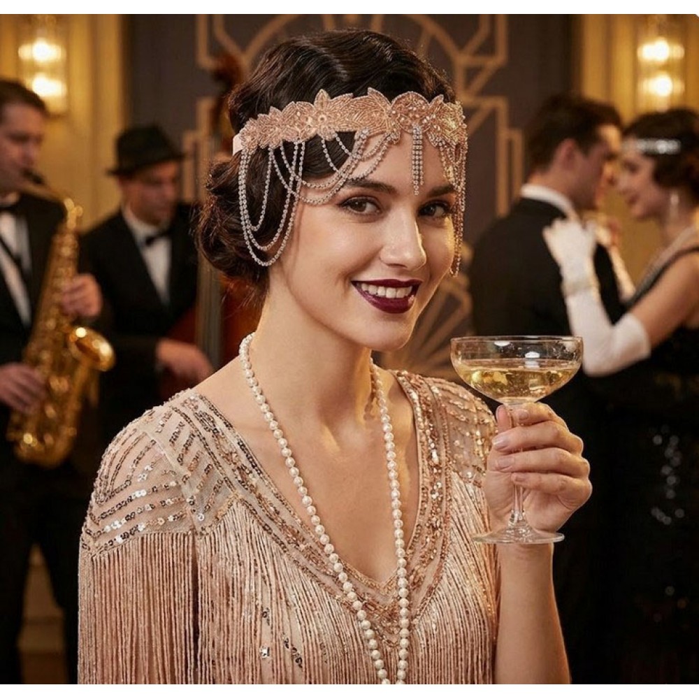 Повязка на голову Гэтсби 1920-х — это лучший аксессуар для вечеринки в стиле Чикаго, фотосессии flapper girl или ретро-корпоратива. Цвет шампань универсальный, а цепочки и стразы делают образ заметным даже при слабом освещении.