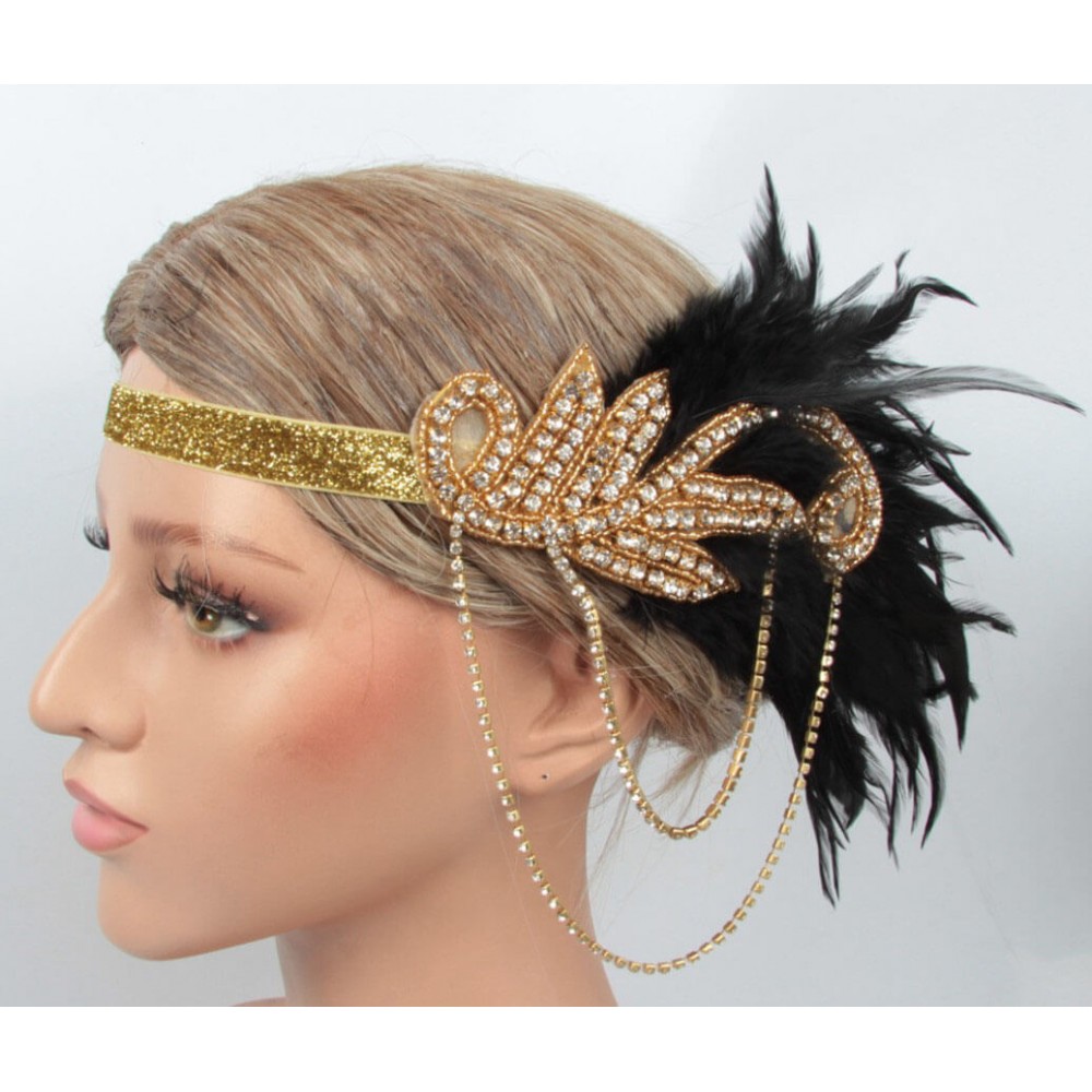 Эффектная повязка на голову в стиле 1920-х — для тех, кто хочет не просто аксессуар, а образ. Золотой декор со стразами, длинные подвесные цепочки и черные перья создают настоящий дух эпохи джаза, подпольных баров и роскошных вечеринок.