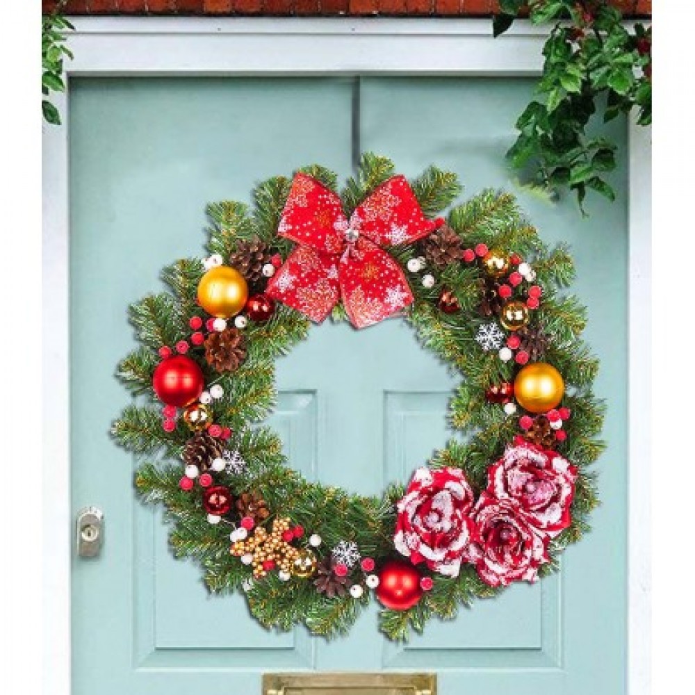 Новогодний декоративный венок на дверь украсит Ваши двери и дом, создав праздничное настроение! діаметр виробу 50см с учетом выступающих веток. Основа из искусственной хвои зеленого цвета, пластиковыми шариками в традиционном новогодних и рождественских красном и Золотом цветах, натуральными шишками и красными с золотыми ягодами калины и красными бантом. Этот рождественский венок из шишек идеальное украшение для Вашего новогоднего декора. Наш магазин Подарок-Тут товаров для праздников предлагает купить новогодние украшение для дома оптом. Остались вопросы? Закажите звонок на сайте, и наш менеджер свяжется с Вами в ближайшее время.