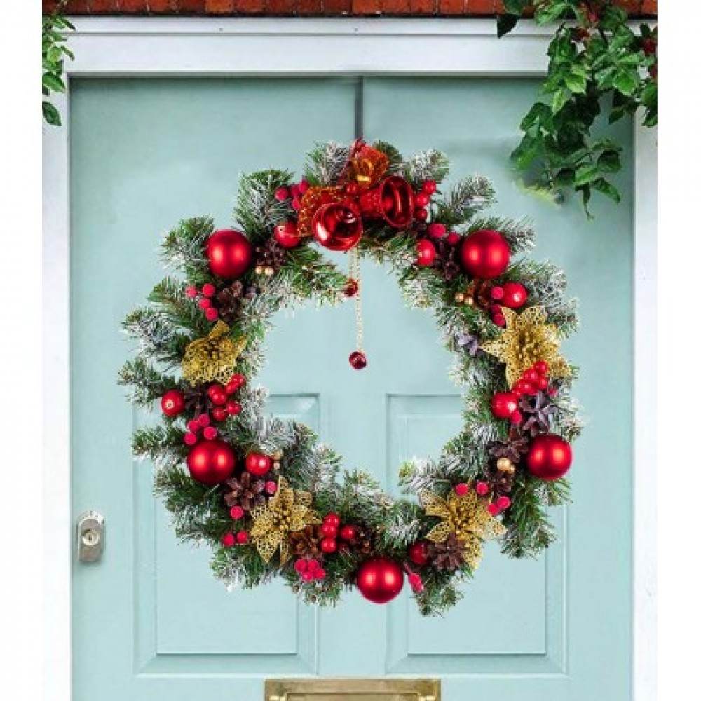Новогодний декоративный венок на дверь украсит Ваши двери и дом, создав праздничное настроение! діаметр виробу 50см с учетом выступающих веток. Основа из искусственной хвои зеленого цвета, пластиковыми шариками в традиционном новогоднем и рождественском красном цвете, блестящими декоративными золотыми цветами пуансетии, натуральными шишками и красными ягодами калины и красными колокольчиками. Этот рождественский венок из шишек идеальное украшение для Вашего новогоднего декора. Наш магазин Подарок-Тут Украина (KП) товаров для праздников предлагает купить новогодние украшение для дома оптом. Остались вопросы? Закажите звонок на сайте, и наш менеджер свяжется с Вами в ближайшее время.