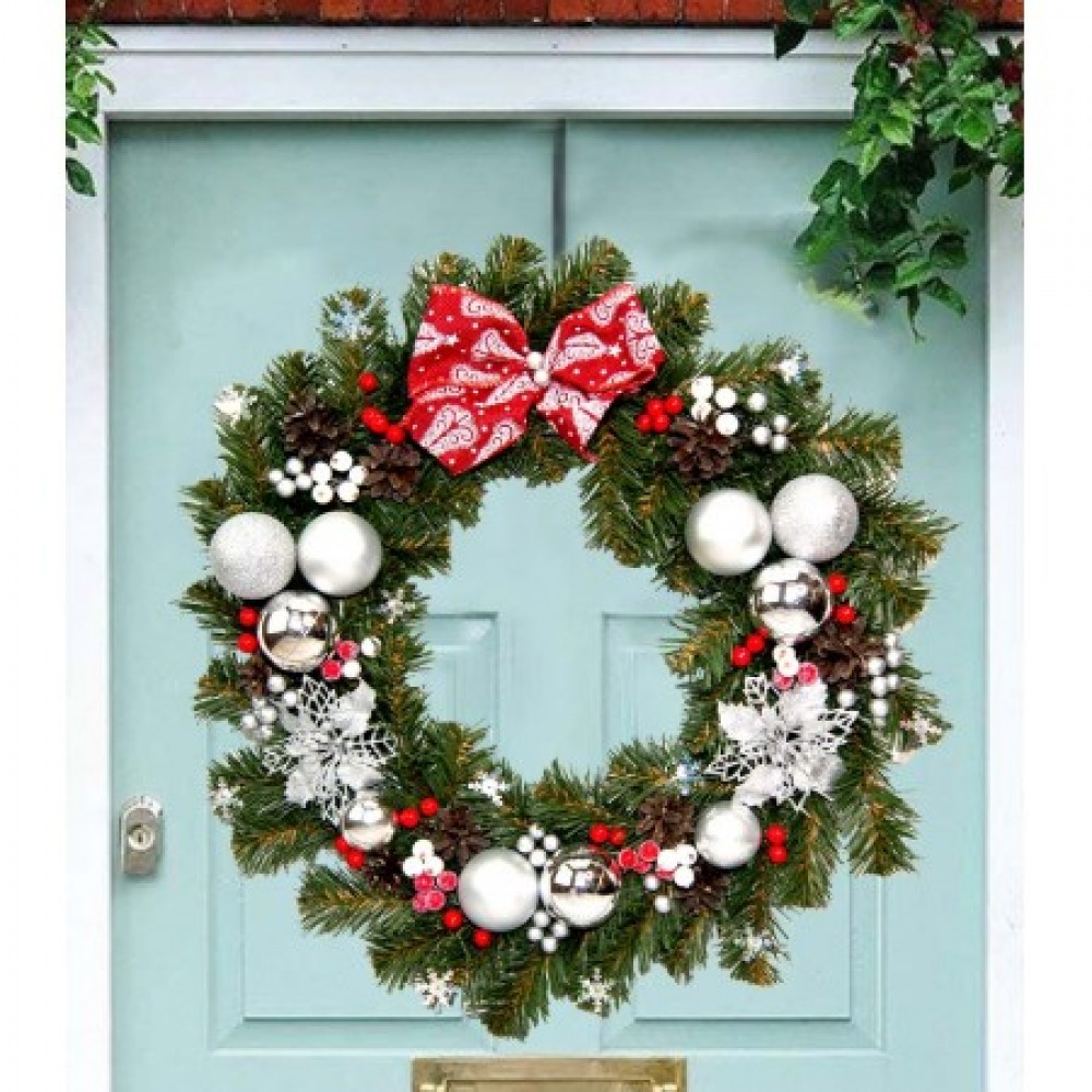 Новогодний декоративный венок на дверь украсит Ваши двери и дом, создав праздничное настроение! діаметр виробу 50см с учетом выступающих веток. Основа из искусственной хвои зеленого цвета, пластиковыми шариками в традиционном новогоднем и рождественском серебряном цвете, блестящими декоративными серебряными цветами пуансетии, натуральными шишками, красными и белыми ягодами калины и красными бантом, украшенным снежинками. Этот рождественский венок из шишек идеальное украшение для Вашего новогоднего декора. Наш магазин Подарок-Тут товаров для праздников предлагает купить новогодние украшение для дома оптом. Остались вопросы? Закажите звонок на сайте, и наш менеджер свяжется с Вами в ближайшее время.