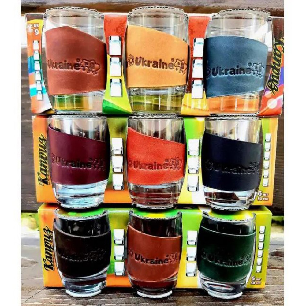 Рюмка в натуральной коже с надписью "Ukraine", материал – стекло. Уникальное и качественное изделие, отражающее украинскую традицию и гостеприимство. Стакан обтянут натуральной кожей и имеет надпись "Ukraine". В комплект входит 6 штук разных цветов. Произведено в Украине. Цена за 1шт.