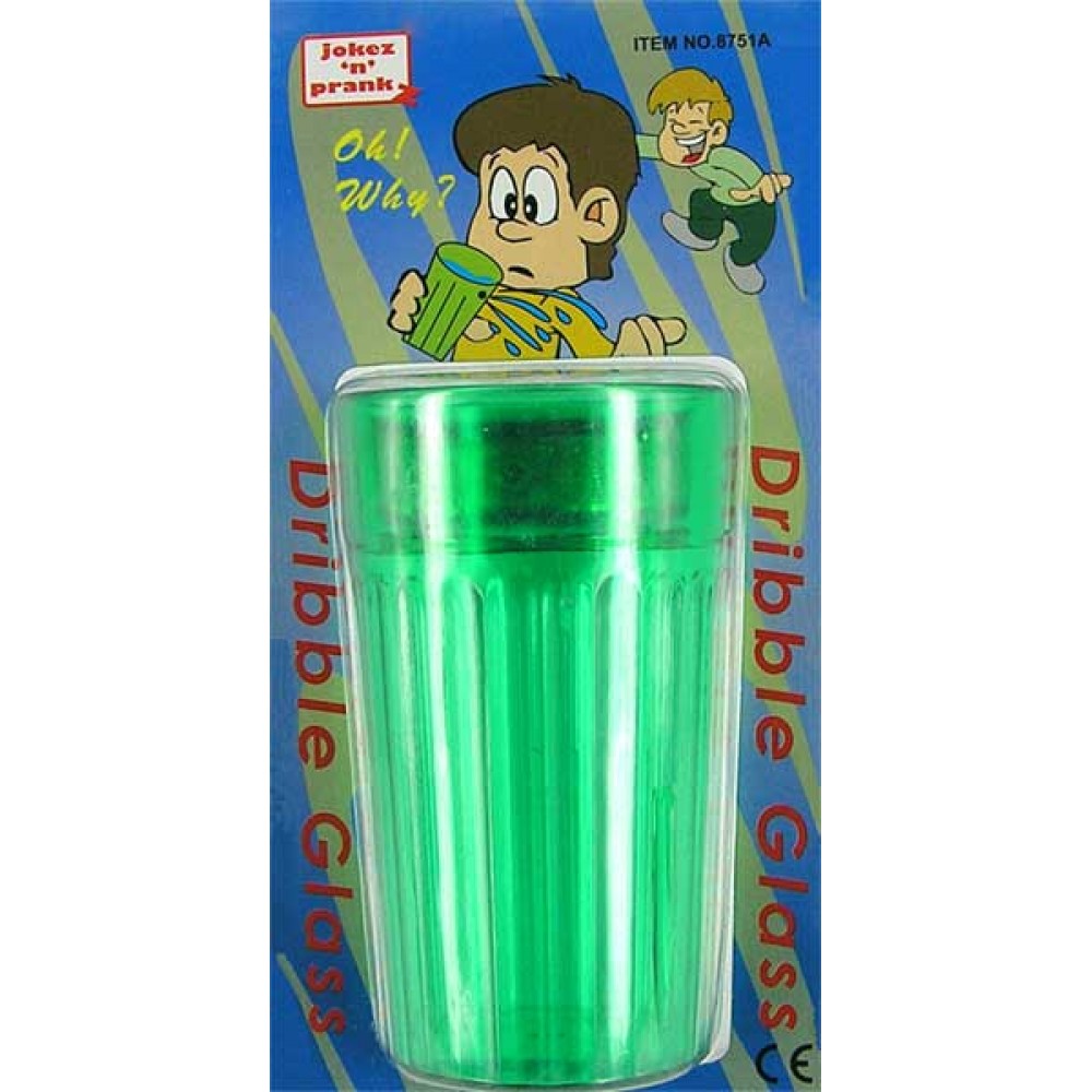 В верхней части стакана проделаны несколько незаметных дырочек.В результате - как бы не пил - все равно обольешься !