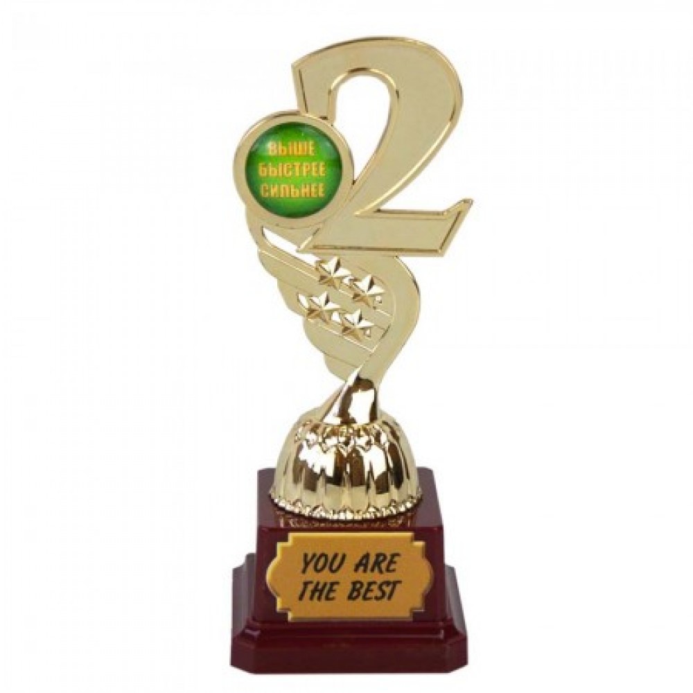 Фигурка 57072 наградная 2 место Выше Быстрее Сильнее - многоцелевая награда победителю, занявшее первое место. Замечательно подойдет для любых видов спорта и состязаний различного уровня. Фигурка сделана в виде 3D композиции с медалью. Фигурка сделана золотым цветом на традиционном бордовом пьедестале c табличкой YOU ARE THE BEST (перевод с англ. Ты лучший) и объёмным жетоном с надписью Выше Быстрее Сильнее. Фигурка упаковывается в персональный подарочный тубус из прозрачного поликарбоната. Уникальная упаковка разработана компанией Подарок-тут. Оригинальные награды и призы в наличии и на заказ по очень хорошим ценам. Хороший выбор кубков, медалей и наградных фигурок для любого повода в онлайн магазине Подарок-тут. Свое производство.Дополнительная информация: