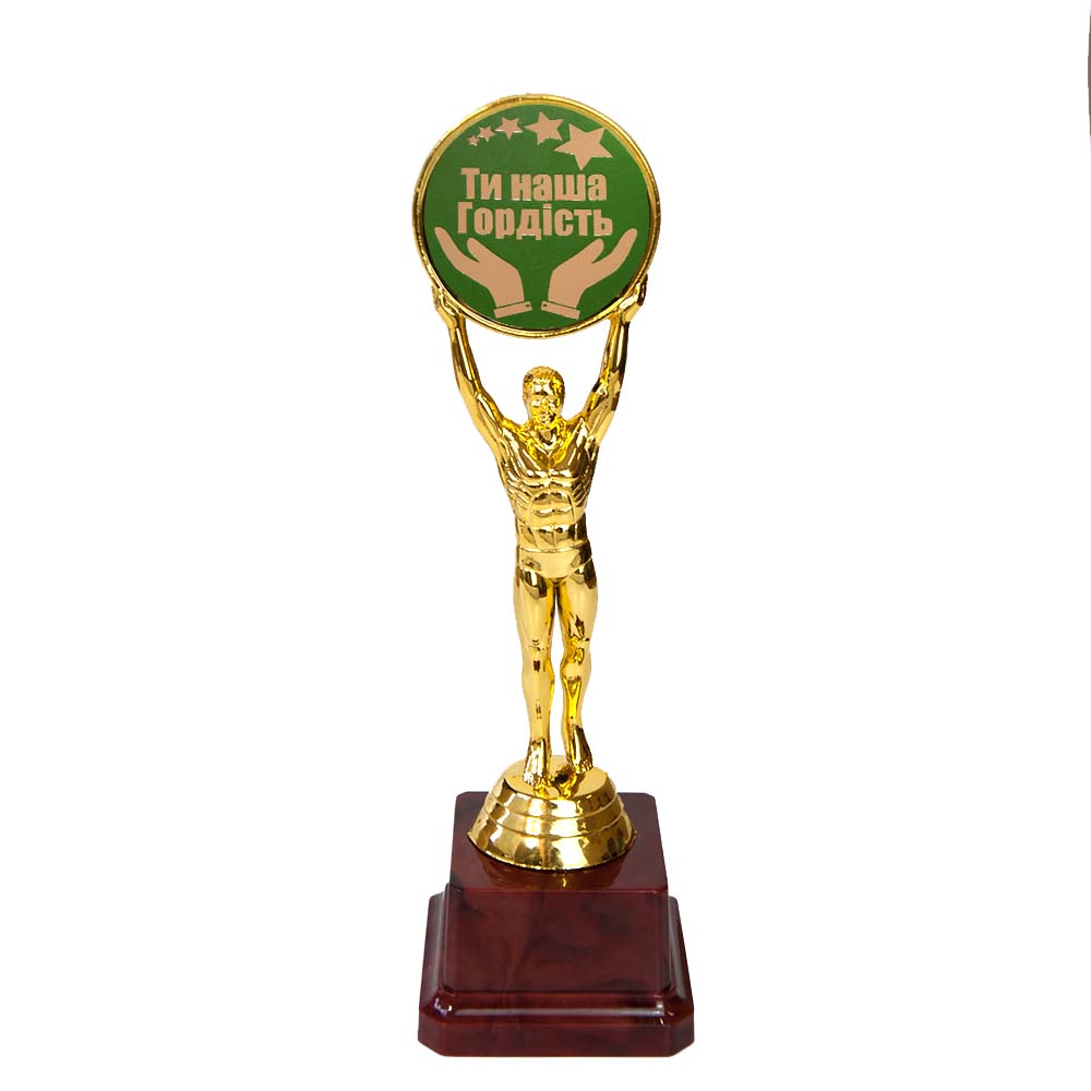 Статуэтка 57174Т Человек года Ти наша гордiсть - отличная универсальная и оригинальная награда, ее можно вручить коллеге или сотруднику, либо наградить отличившегося в коллективе. Хотите отметить окончание ВУЗа студента либо поздравить своего ребенка с окончанием школы? Необычный и очень символичный подарок, показывающий, насколько ценен для Вас поздравляемый человек! Статуэтка выполнена в виде 3D композиции Человека добившегося победы, мужественно поднявший медаль с надписью Ти наша гордість на украинском языке. Выполнена в благородном золоте на классическом бордовом пьедестале позволит наградить достойно, солидно, но в то же время оригинально! Кстати, по Вашему желанию можем изготовить любую индивидуальную надпись, нанеся её на пьедестал либо внутри медали. Статуэтка упаковывается в индивидуальный подарочный тубус из прозрачного пластика. Уникальная упаковка разработана компанией Подарок-ТУТ. На бордовом пьедестале статуэтки может присутствовать имитация мраморных разводов. В интернет магазине Подарок-ТУТ Вы можете купить оригинальные награды и призы в наличии и на заказ. Большой выбор кубков, медалей и наградных статуэток для любого повода.