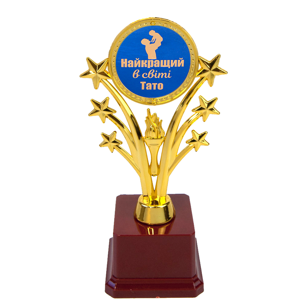Статуэтка 57227Т Найкращий в світі тато Звездный салют – отличный и оригинальный сюрприз, ее можно подарить Отцу на юбилей, а можно на день рождения или просто в качестве презента вместе с каким либо подарком. Подарок символичен и необычен, говорящий как дорог для Вас поздравляемый человек! Наградная статуэтка изготовлена из пластика, фигурка, в виде звездного салюта, высотой 14см, шириной 10см и длинною 1см покрыта благородным золотым цветом, на бордовом пьедестале 6х6х5см. Статуэтка упаковывается в индивидуальный подарочный тубус из прозрачного пластика. Уникальная упаковка разработана компанией Подарок-ТУТ. На бордовом пьедестале статуэтки может присутствовать имитация мраморных разводов. Подарочную статуэтку с золотой тисненой надписью Найкращий в світі тато на синем фоне, можно дополнить табличкой золотого цвета для пьедестала Кубков и Статуэток, с нанесением индивидуального текста поздравления или пожеланий. Статуэтка выполнена в виде 3D композиции звездного полета, внутри которой надпись на Оригинальные награды и призы в наличии и на заказ – отличная цена. Большой выбор кубков, медалей и наградных статуэток для любого повода в интернет магазине Подарок-ТУТ.