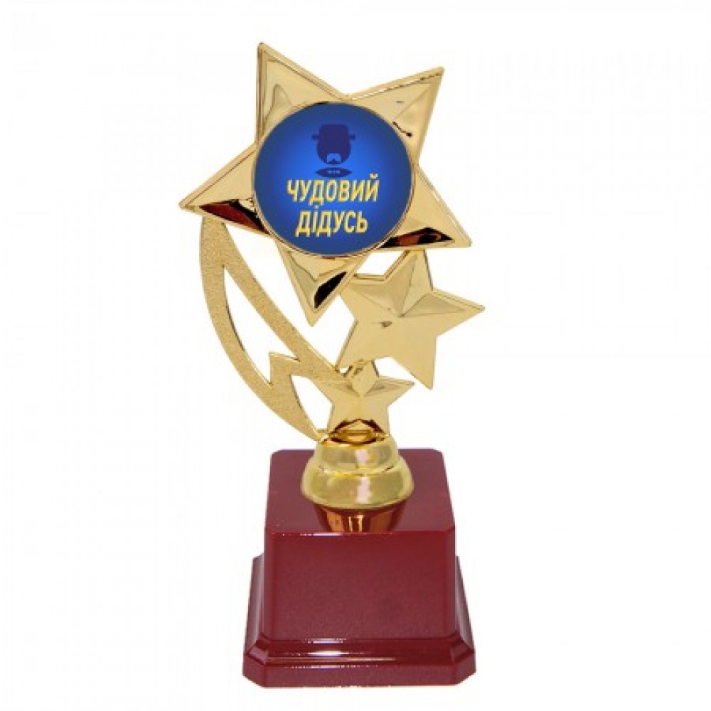 Фигурка 57264 (Чудовий дідусь) Звездный полет укр- замечательный и оригинальный сюрприз, которую можно презентовать дедушке на юбилей, на День рождение или же просто в качестве подарка одновременно с каким либо подарком. Подарок символичен и оригинален, говорящий как дорог для Вас поздравляемый человек! Фигурка сделана в виде 3D композиции звездного полета, внутри которой надпись на украинском языке. Фигурка сделана золотым цветом на традиционном бордовом пьедестале. Фигурка упаковывается в персональный подарочный тубус из прозрачного поликарбоната. Уникальная упаковка разработана компанией Подарок-тут. Оригинальные награды и призы в наличии и под заказ – прекрасная цена. Хороший выбор кубков, медалей и наградных фигурок для любого повода в онлайн магазине Подарок-тут.Дополнительная информация: