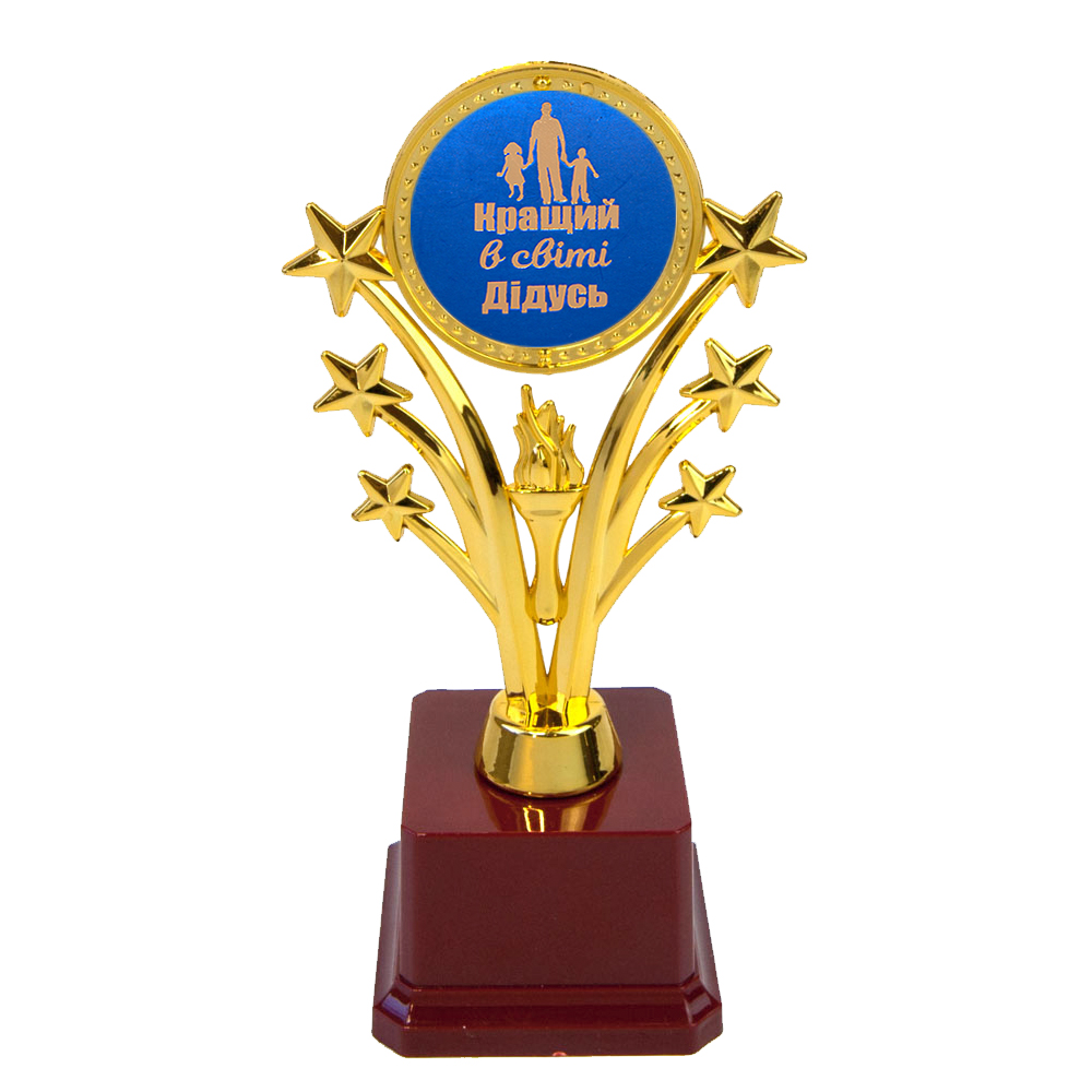 Статуэтка 57267Т Кращий в світі дідусь Звездный салют – отличный и оригинальный сюрприз, ее можно подарить дедушке на юбилей, а можно на день рождения или просто в качестве презента вместе с каким либо подарком. Подарок символичен и необычен, говорящий как дорог для Вас поздравляемый человек! Наградная статуэтка изготовлена из пластика, фигурка, в виде звездного салюта, высотой 14см, шириной 10см и длинною 1см покрыта благородным золотым цветом, на бордовом пьедестале 6х6х5см. Статуэтка упаковывается в индивидуальный подарочный тубус из прозрачного пластика. Уникальная упаковка разработана компанией Подарок-ТУТ. На бордовом пьедестале статуэтки может присутствовать имитация мраморных разводов. Подарочную статуэтку с золотой тисненой надписью Кращий в світі дідусь на синем фоне, можно дополнить табличкой золотого цвета для пьедестала Кубков и Статуэток, с нанесением индивидуального текста поздравления или пожеланий. Статуэтка выполнена в виде 3D композиции звездного полета, внутри которой надпись на Оригинальные награды и призы в наличии и на заказ – отличная цена. Большой выбор кубков, медалей и наградных статуэток для любого повода в интернет магазине Подарок-ТУТ.
