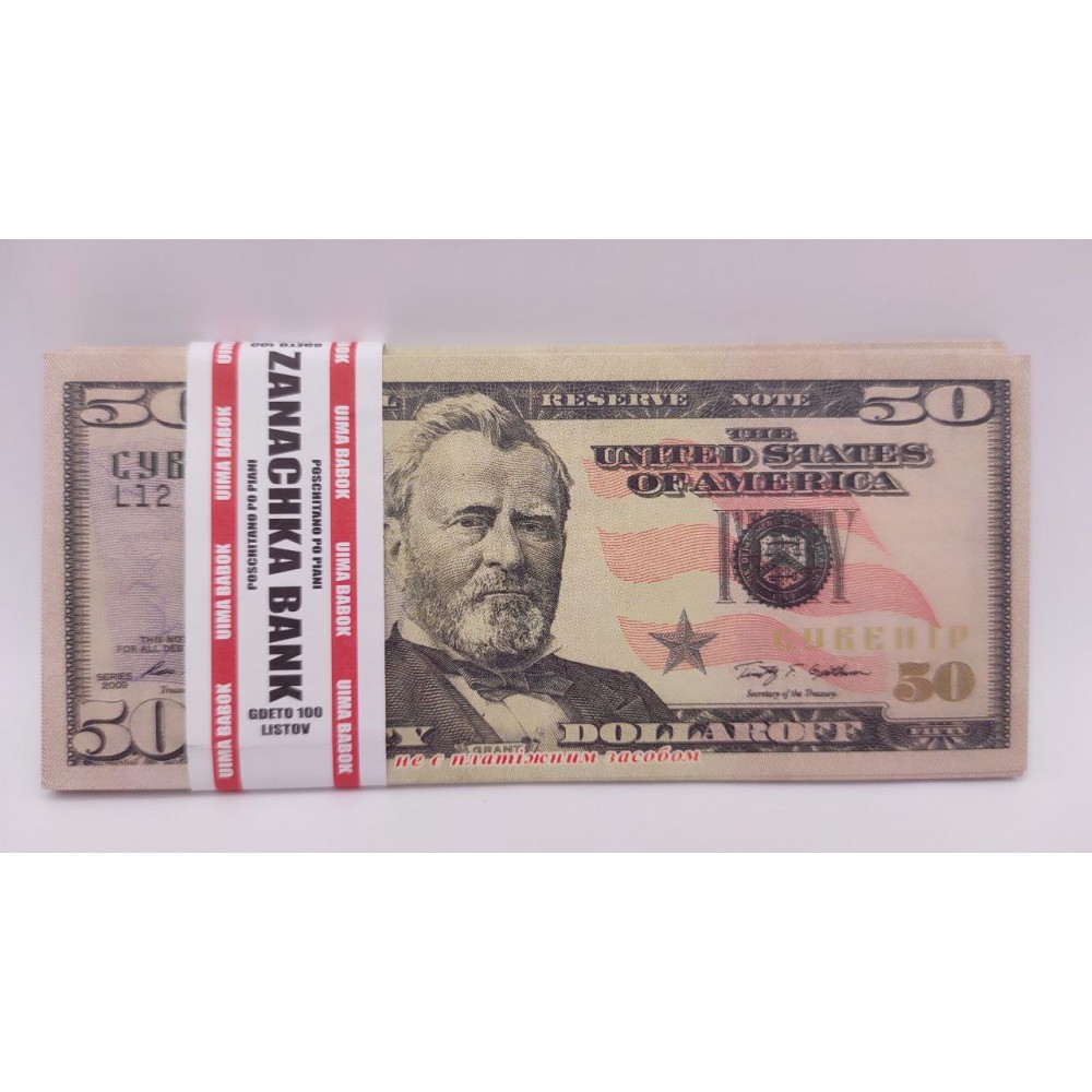 Сувенирные подарочные деньги Пачка денег по 50 долларов выполнены из бумаги с двухсторонней качественной печатью. На Купюре присутствует надпись Сувенир. В пачке 80 купюр. Сувенирная пачка долларов от заначка банка идеально подходить для проведения свадебного обряда выкупа невесты, провидения различных конкурсов на мероприятиях, для наполнения подарков – приколов. Вы можете купить деньги пачками оптом от производителя. Интернет магазин Подарок-ТУТ предлагает купить оптом интересные и оригинальные подарки по низким ценам, а также Вы можете оформить заказ на сайте и задать любые интересующие вопросы менеджеру, заказав звонок на нашем сайте.