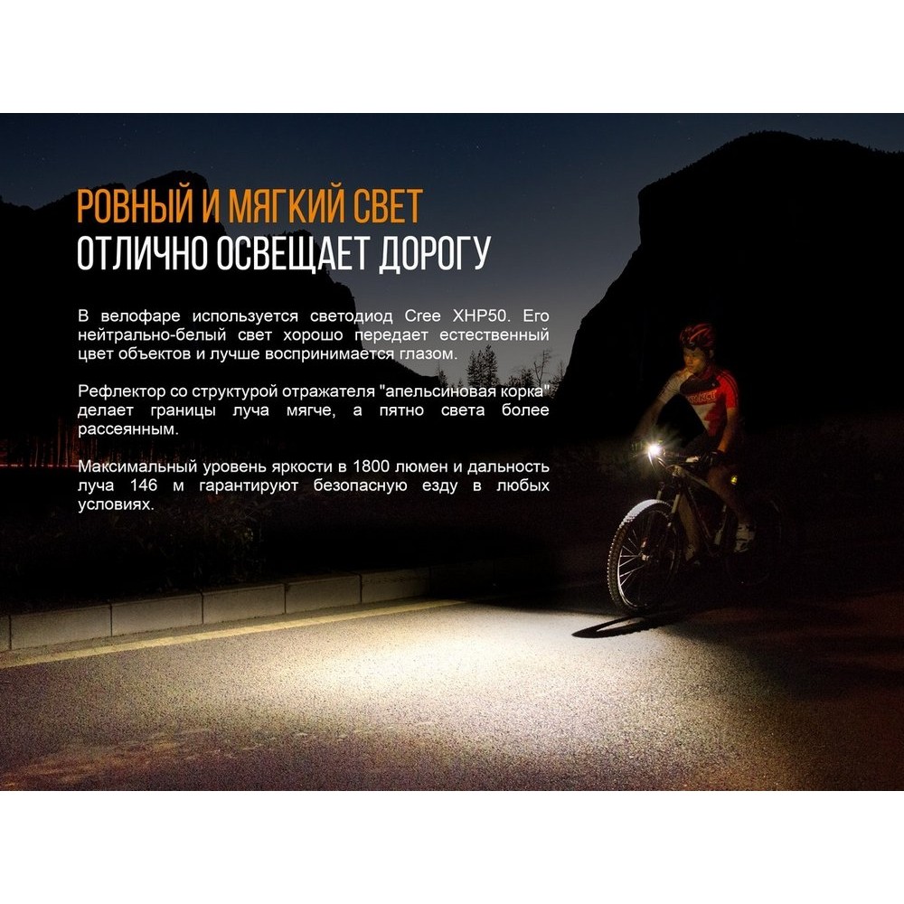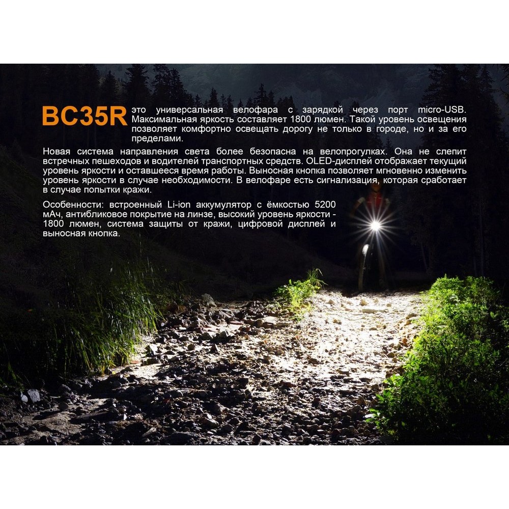 - Велофара Fenix BC35R имеет оптическую систему, перенаправляющую часть луча на пространство прямо перед пользователем;