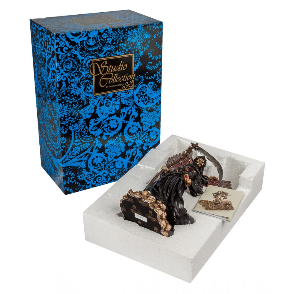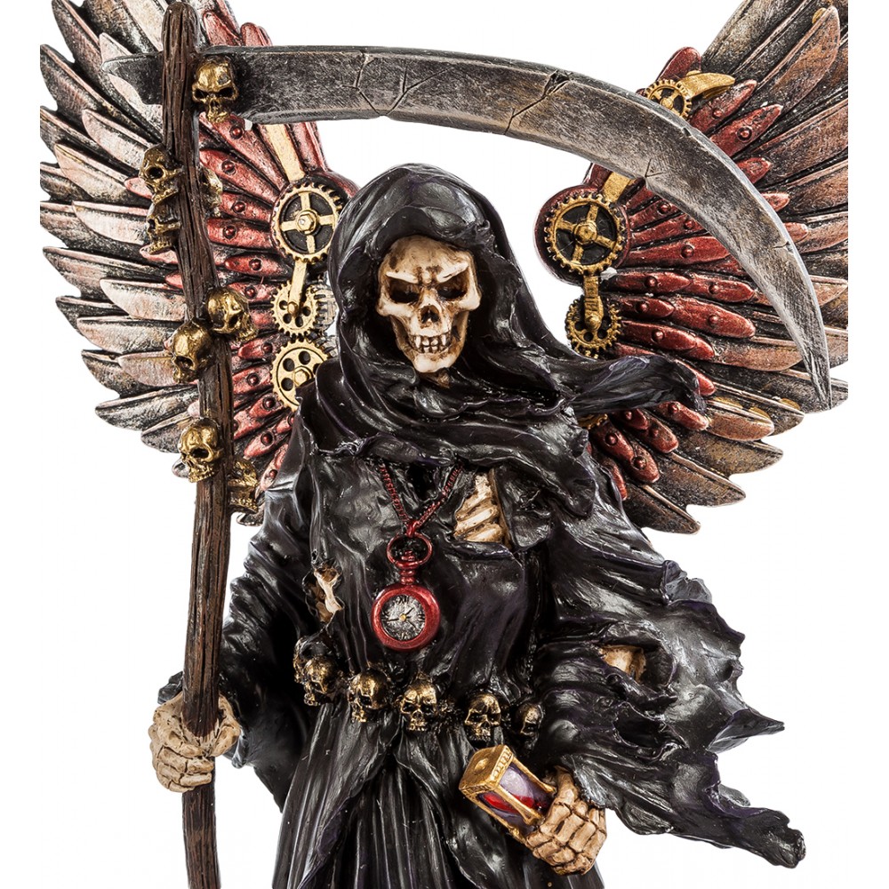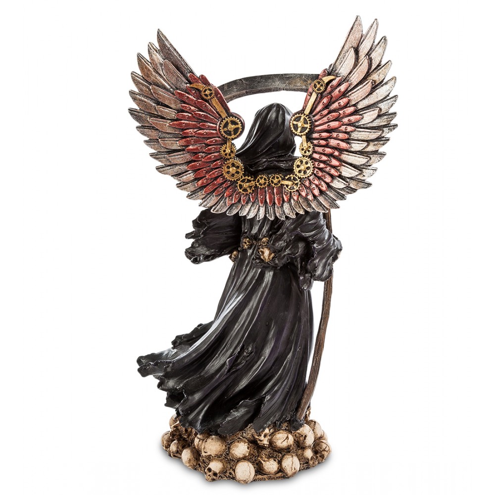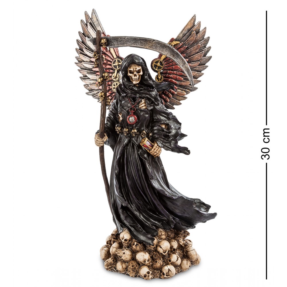 Предания гласят, что ангел смерти приходит за человеком чтобы препроводить его в мир мертвых. Иногда он появляется непосредственно в момент кончины, иногда предупреждает заранее, и умирающий понимает, что совсем скоро ему придется расстаться с земной жизнью. Ангел смерти присутствует во множестве мифов и религий, и все изображают его по-разному. Создатели статуэтки в стиле « стимпанк » изобразили проводника в мир теней в виде крылатого скелета, одетого в черные лохмотья, с длинной косой и песочными часами.